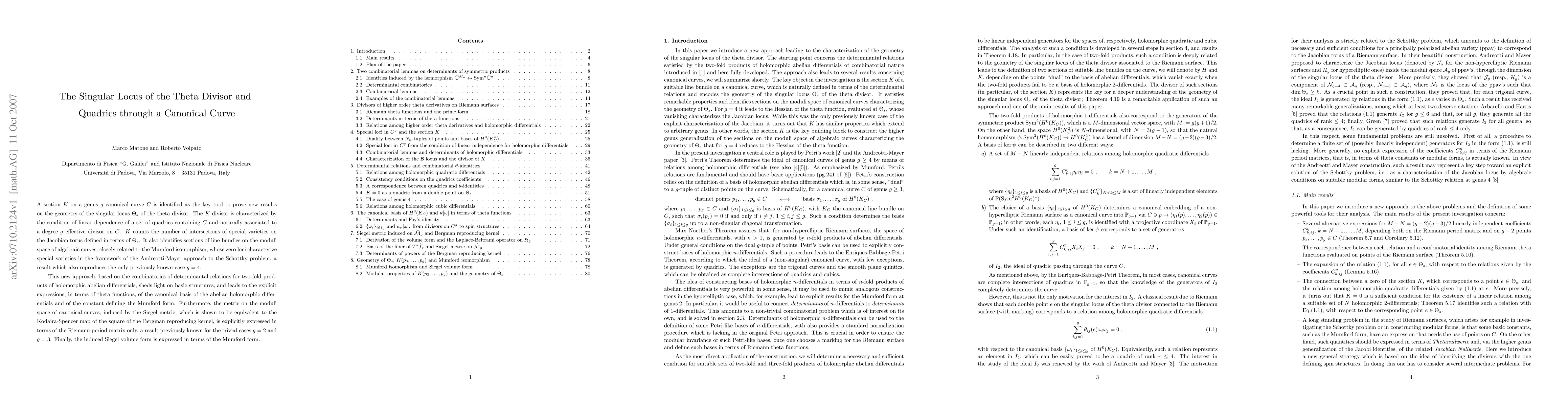 A section K on a genus g canonical curve C is identified as the key tool to prove new results on the geometry of the singular locus Theta_s of the theta divisor. The K divisor is characterized by the condition of linear dependence of a set of quadrics containing C and naturally associated to a degree g effective divisor on C. K counts the number of intersections of special varieties on the Jacobian torus defined in terms of Theta_s. It also identifies sections of line bundles on the moduli space of algebraic curves, closely related to the Mumford isomorphism, whose zero loci characterize special varieties in the framework of the Andreotti-Mayer approach to the Schottky problem, a result which also reproduces the only previously known case g=4. This new approach, based on the combinatorics of determinantal relations for two-fold products of holomorphic abelian differentials, sheds light on basic structures, and leads to the explicit expressions, in terms of theta functions, of the canonical basis of the abelian holomorphic differentials and of the constant defining the Mumford form. Furthermore, the metric on the moduli space of canonical curves, induced by the Siegel metric, which is shown to be equivalent to the Kodaira-Spencer map of the square of the Bergman reproducing kernel, is explicitly expressed in terms of the Riemann period matrix only, a result previously known for the trivial cases g=2 and g=3. Finally, the induced Siegel volume form is expressed in terms of the Mumford form.