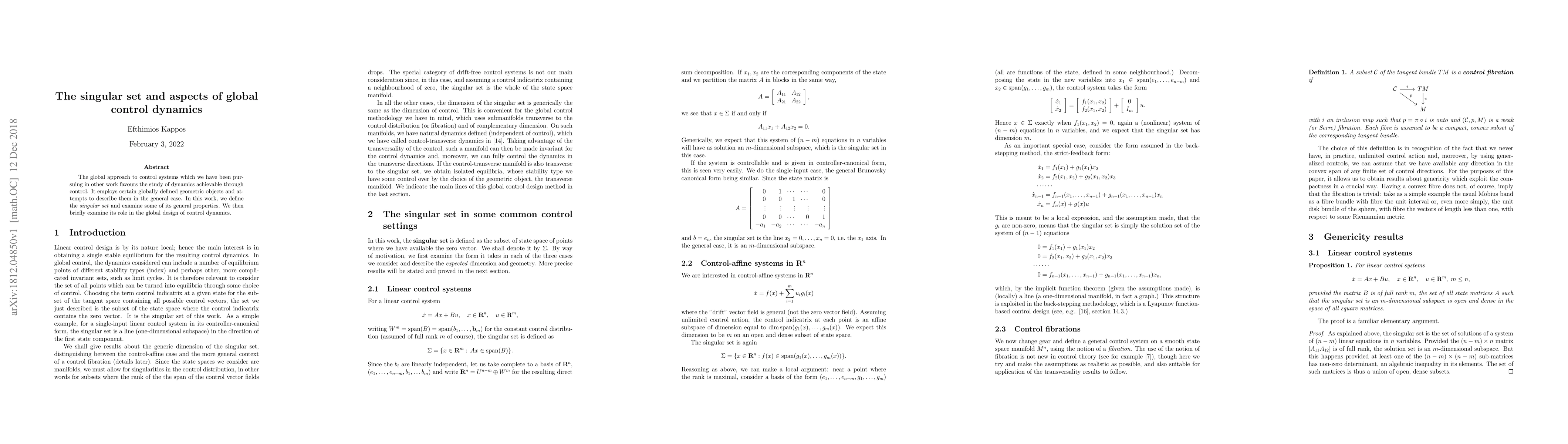 Researchers explore the properties of a mathematical concept called the singular set in control systems, which helps design global control dynamics. This study aims to better understand how to analyze and apply this concept to create more efficient control systems.