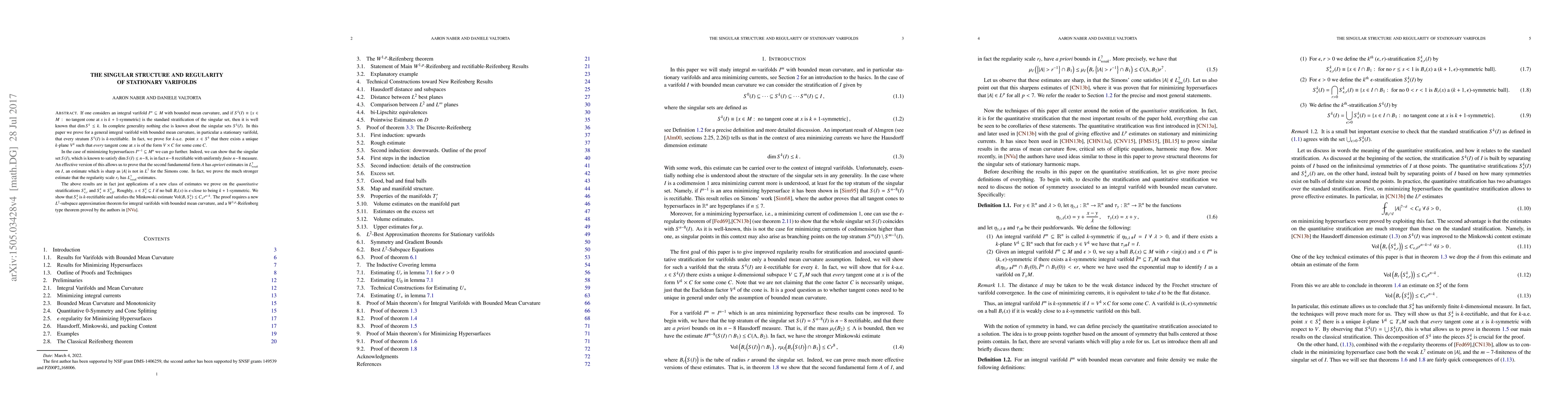 If one considers an integral varifold $I^m\subseteq M$ with bounded mean curvature, and if $S^k(I)\equiv\{x\in M: \text{ no tangent cone at $x$ is }k+1\text{-symmetric}\}$ is the standard stratification of the singular set, then it is well known that $\dim S^k\leq k$. In complete generality nothing else is known about the singular sets $S^k(I)$. In this paper we prove for a general integral varifold with bounded mean curvature, in particular a stationary varifold, that every stratum $S^k(I)$ is $k$-rectifiable. In fact, we prove for $k$-a.e. point $x\in S^k$ that there exists a unique $k$-plane $V^k$ such that every tangent cone at $x$ is of the form $V\times C$ for some cone $C$. In the case of minimizing hypersurfaces $I^{n-1}\subseteq M^n$ we can go further. Indeed, we can show that the singular set $S(I)$, which is known to satisfy $\dim S(I)\leq n-8$, is in fact $n-8$ rectifiable with uniformly finite $n-8$ measure. An effective version of this allows us to prove that the second fundamental form $A$ has apriori estimates in $L^7_{weak}$ on $I$, an estimate which is sharp as $|A|$ is not in $L^7$ for the Simons cone. In fact, we prove the much stronger estimate that the regularity scale $r_I$ has $L^7_{weak}$-estimates. The above results are in fact just applications of a new class of estimates we prove on the quantitative stratifications $S^k_{\epsilon,r}$ and $S^k_{\epsilon}\equiv S^k_{\epsilon,0}$. Roughly, $x\in S^k_{\epsilon}\subseteq I$ if no ball $B_r(x)$ is $\epsilon$-close to being $k+1$-symmetric. We show that $S^k_\epsilon$ is $k$-rectifiable and satisfies the Minkowski estimate $Vol(B_r\,S_\epsilon^k)\leq C_\epsilon r^{n-k}$. The proof requires a new $L^2$-subspace approximation theorem for integral varifolds with bounded mean curvature, and a $W^{1,p}$-Reifenberg type theorem proved by the authors in \cite{NaVa+}.