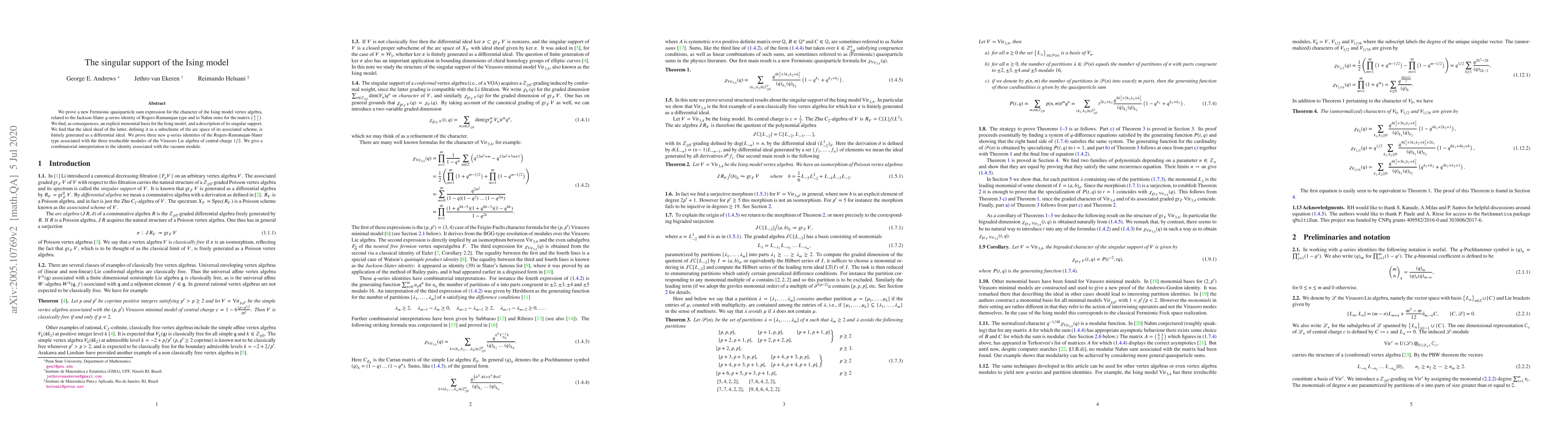 We prove a new Fermionic quasiparticle sum expression for the character of the Ising model vertex algebra, related to the Jackson-Slater $q$-series identity of Rogers-Ramanujan type and to Nahm sums for the matrix $\left( \begin{smallmatrix} 8 & 3 \\ 3 & 2 \end{smallmatrix} \right)$. We find, as consequences, an explicit monomial basis for the Ising model, and a description of its singular support. We find that the ideal sheaf of the latter, defining it as a subscheme of the arc space of its associated scheme, is finitely generated as a differential ideal. We prove three new $q$-series identities of the Rogers-Ramanujan-Slater type associated with the three irreducible modules of the Virasoro Lie algebra of central charge $1/2$. We give a combinatorial interpretation to the identity associated with the vacuum module.