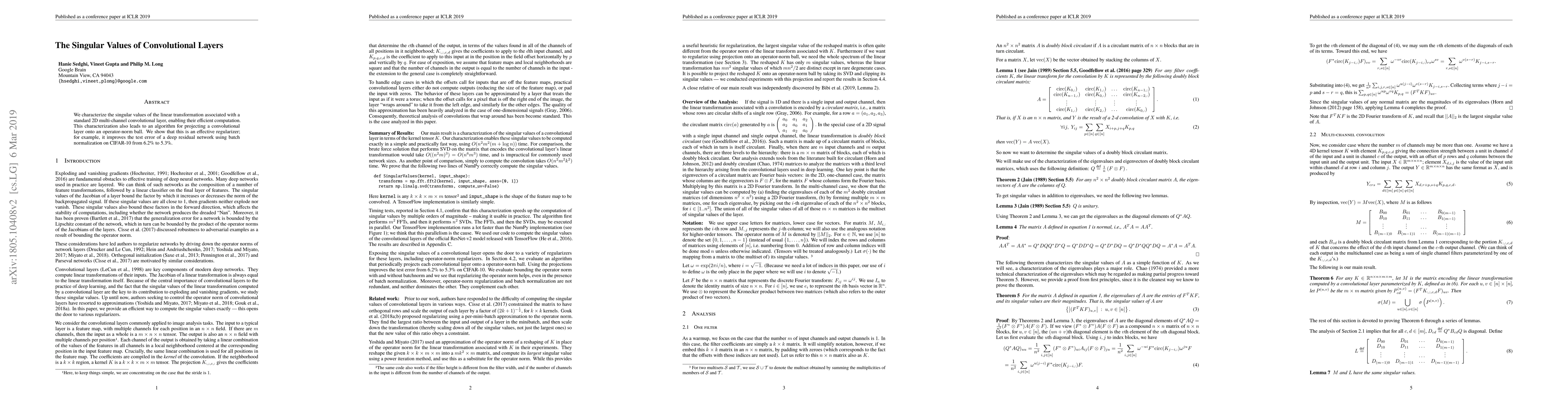 This paper characterizes the singular values of convolutional layers and presents an efficient algorithm for computing them, which also enables projecting these layers onto an operator-norm ball. The proposed method acts as an effective regularizer, demonstrated by a reduction in test error for a deep residual network on CIFAR-10.
