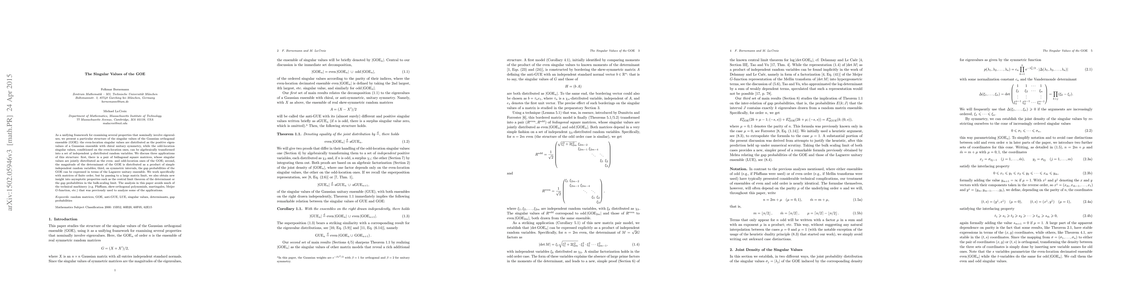 This paper reveals a novel structure in the singular values of the Gaussian orthogonal ensemble (GOE), showing that even-location singular values follow a Gaussian ensemble with chiral unitary symmetry, while odd-location singular values transform into independent $\chi$-distributed variables. It also explores applications including bidiagonal matrices, determinant magnitude distribution, and gap probabilities linked to the Laguerre unitary ensemble.