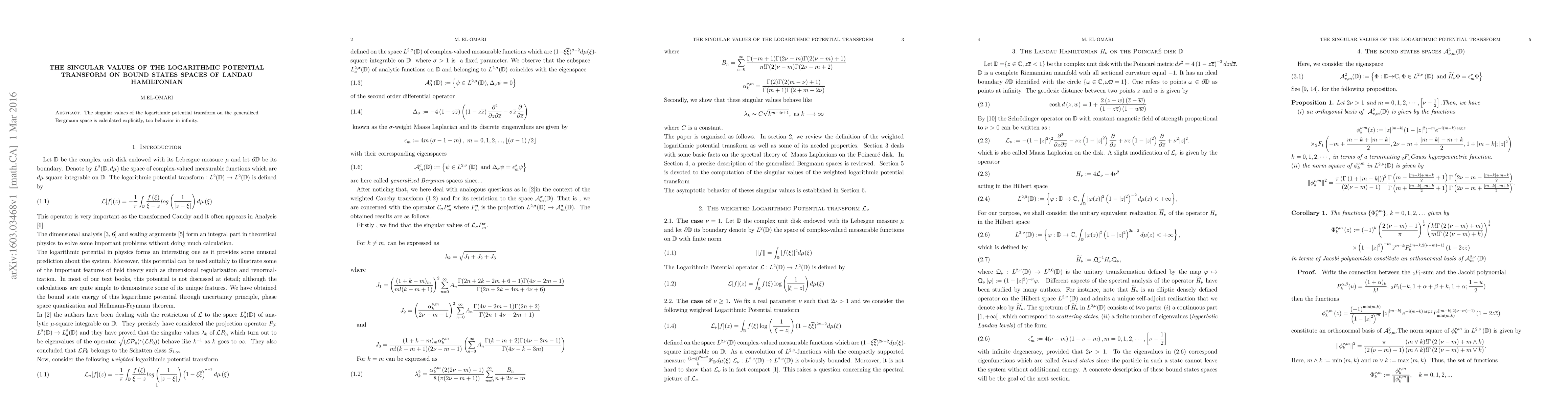 The singular values of the logarithmic potential transform on the generalized Bergmann space is calculated explicitly, too behavior in infinity