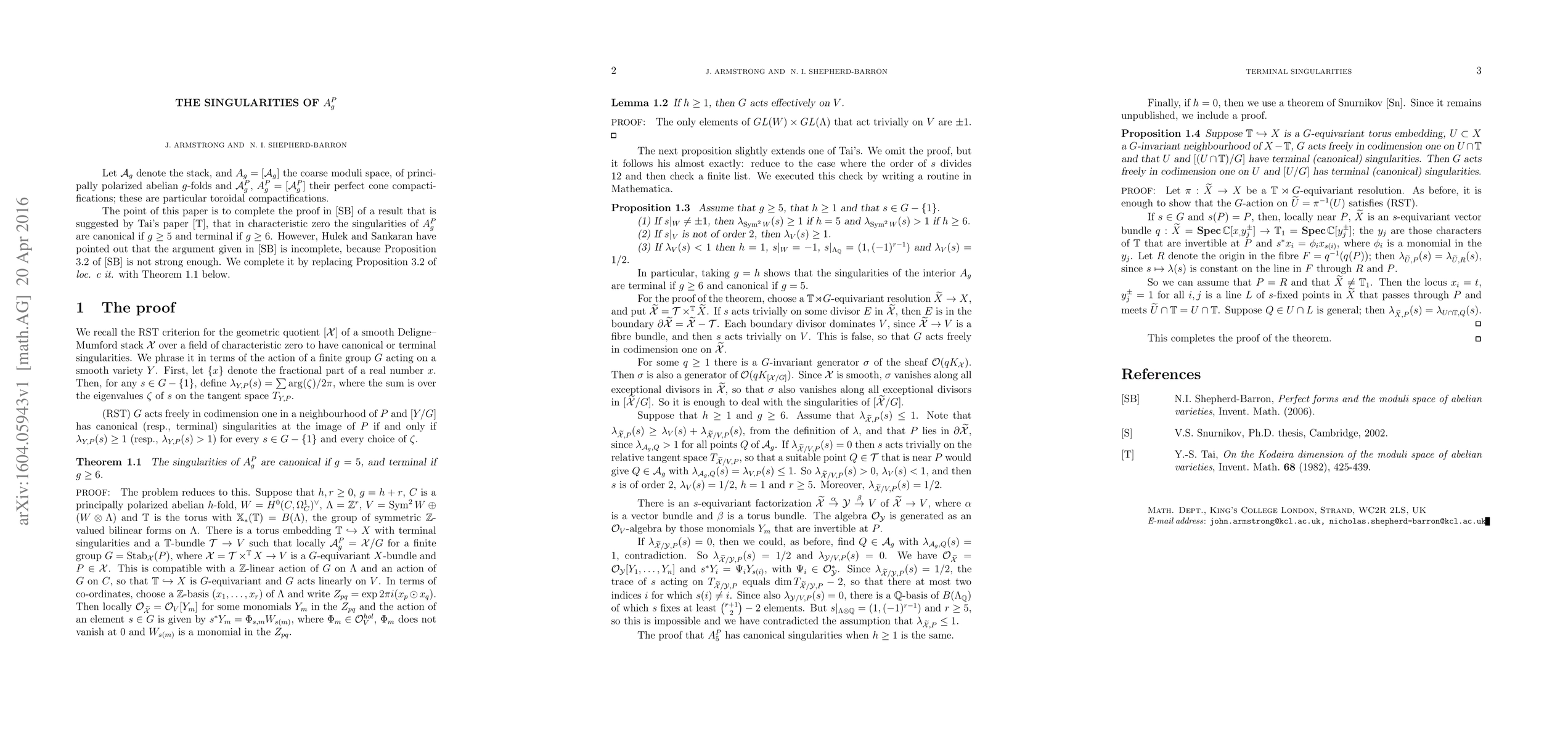 We complete the proof given earlier by one of us that the singularities of the perfect cone compactification $A_g^P$ of the coarse moduli space $A_g$ of principally polarized abelian $g$-folds are terminal if $g\ge 6$, and canonical if $g=5$.