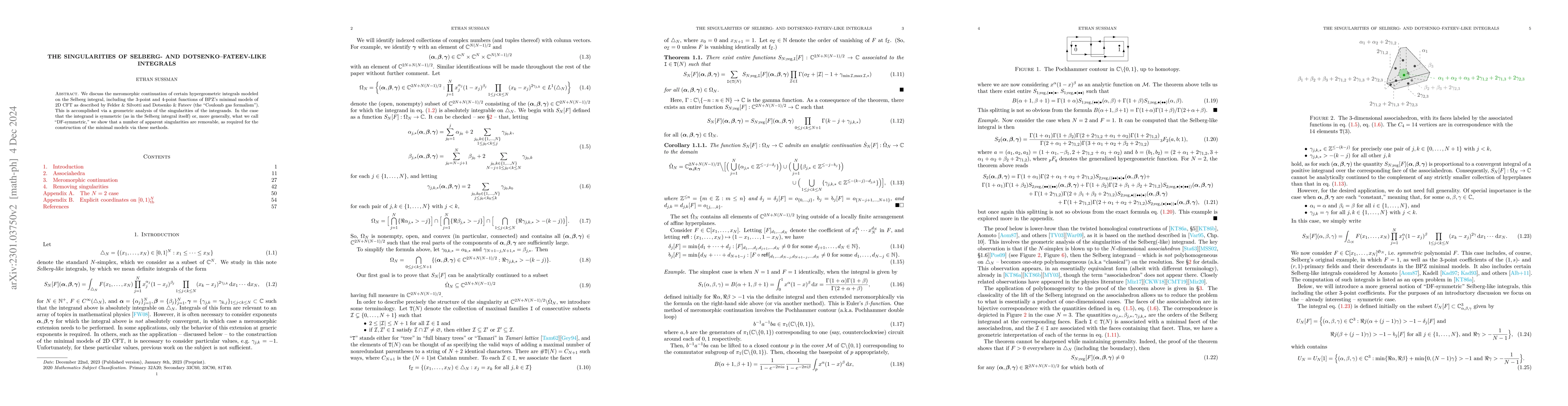 This paper investigates the meromorphic continuation of hypergeometric integrals inspired by Selberg and Dotsenko-Fateev models, focusing on the singularities of these integrals. It demonstrates that many apparent singularities are removable when the integrands are symmetric or "DF-symmetric," facilitating the construction of 2D CFT minimal models.