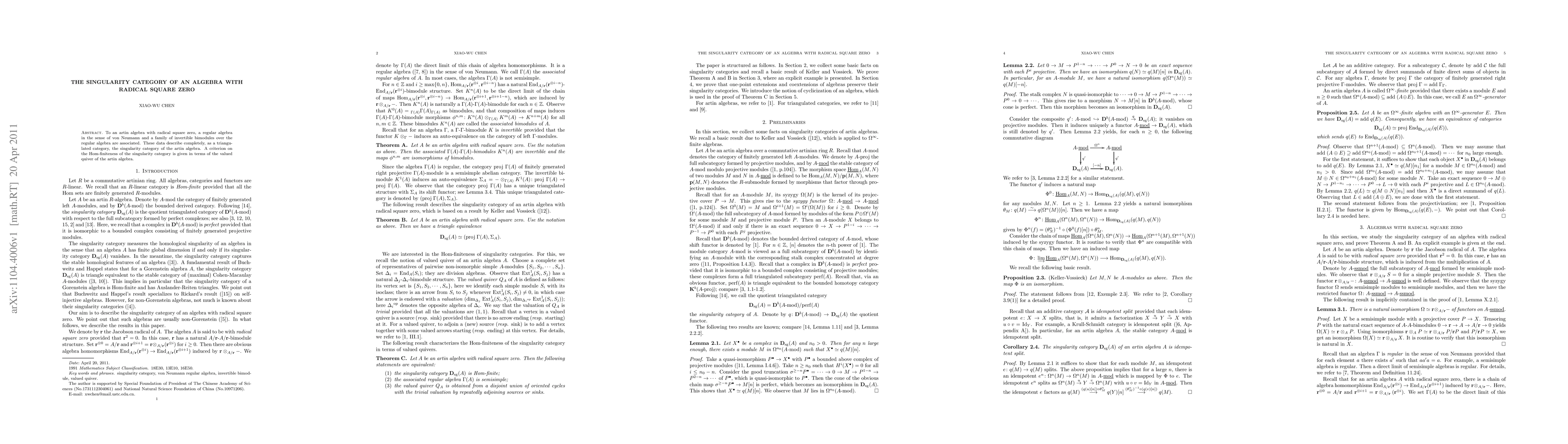 To an artin algebra with radical square zero, a regular algebra in the sense of von Neumann and a family of invertible bimodules over the regular algebra are associated. These data describe completely, as a triangulated category, the singularity category of the artin algebra. A criterion on the Hom-finiteness of the singularity category is given in terms of the valued quiver of the artin algebra.