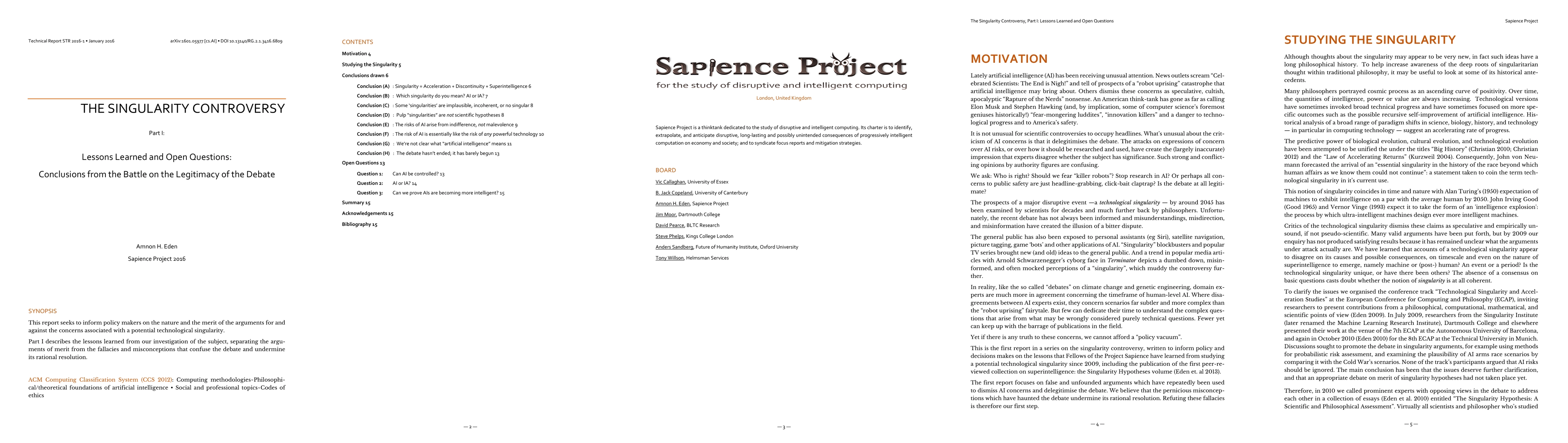 This report seeks to inform policy makers on the nature and the merit of the arguments for and against the concerns associated with a potential technological singularity. Part I describes the lessons learned from our investigation of the subject, separating the argu-ments of merit from the fallacies and misconceptions that confuse the debate and undermine its rational resolution.