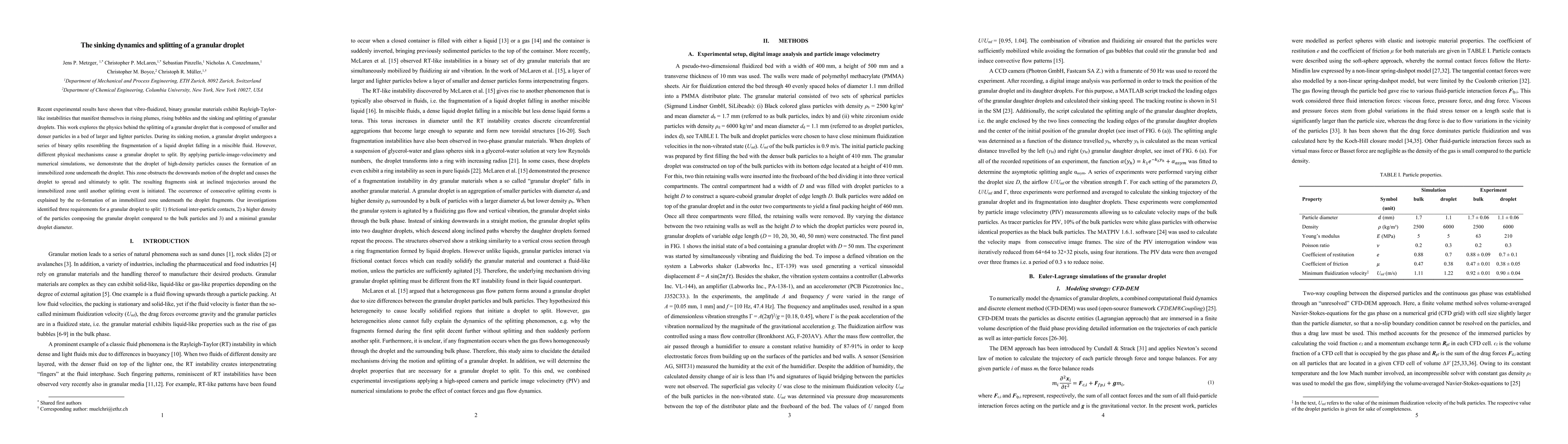 A combination of CFD-DEM simulations and experiments were used to study the sinking dynamics and splitting of a granular droplet.