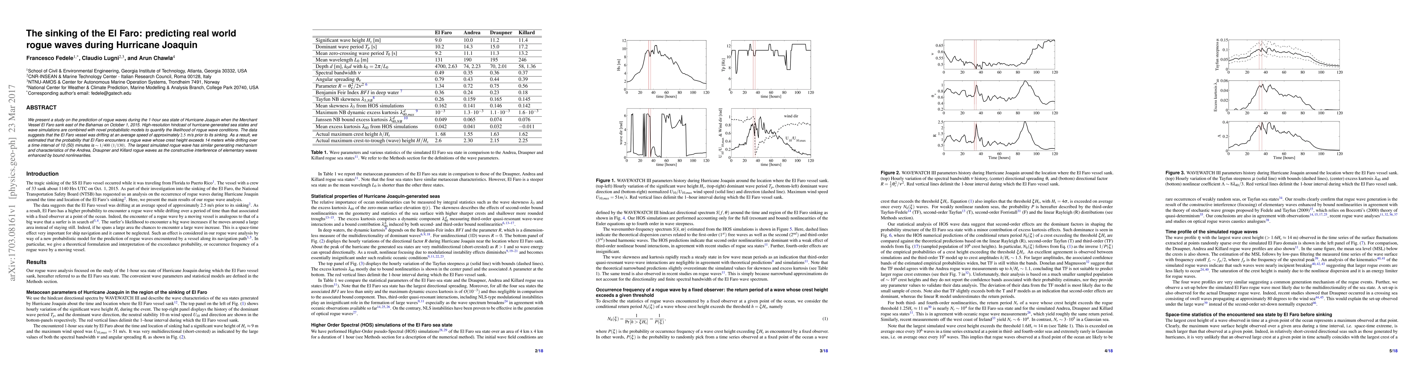 We present a study on the prediction of rogue waves during the 1-hour sea state of Hurricane Joaquin when the Merchant Vessel El Faro sank east of the Bahamas on October 1, 2015. High-resolution hindcast of hurricane-generated sea states and wave simulations are combined with novel probabilistic models to quantify the likelihood of rogue wave conditions. The data suggests that the El Faro vessel was drifting at an average speed of approximately~$2.5$~m/s prior to its sinking. As a result, we estimated that the probability that El Faro encounters a rogue wave whose crest height exceeds 14 meters while drifting over a time interval of 10~(50) minutes is $\sim1/400$~$(1/130)$. The largest simulated rogue wave has similar generating mechanism and characteristics of the Andrea, Draupner and Killard rogue waves as the constructive interference of elementary waves enhanced by bound nonlinearities.