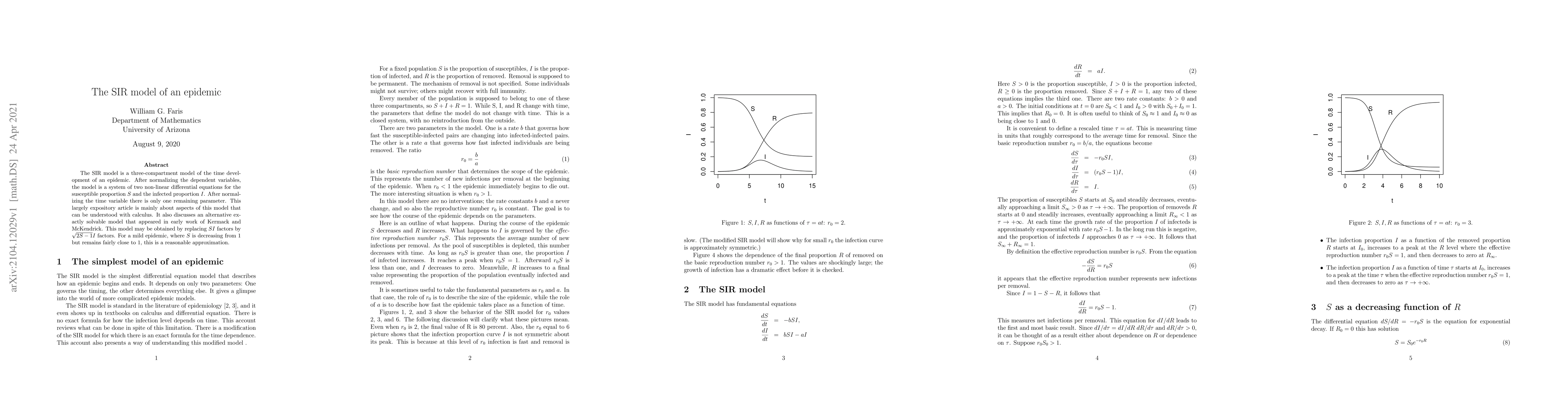 The SIR model is a three-compartment model of the time development of an epidemic. After normalizing the dependent variables, the model is a system of two non-linear differential equations for the susceptible proportion $S$ and the infected proportion $I$. After normalizing the time variable there is only one remaining parameter. This largely expository article is mainly about aspects of this model that can be understood with calculus. It also discusses an alternative exactly solvable model that appeared in early work of Kermack and McKendrick. This model may be obtained by replacing $SI$ factors by $\sqrt{2S-1}I$ factors. For a mild epidemic, where $S$ is decreasing from 1 but remains fairly close to 1, this is a reasonable approximation.