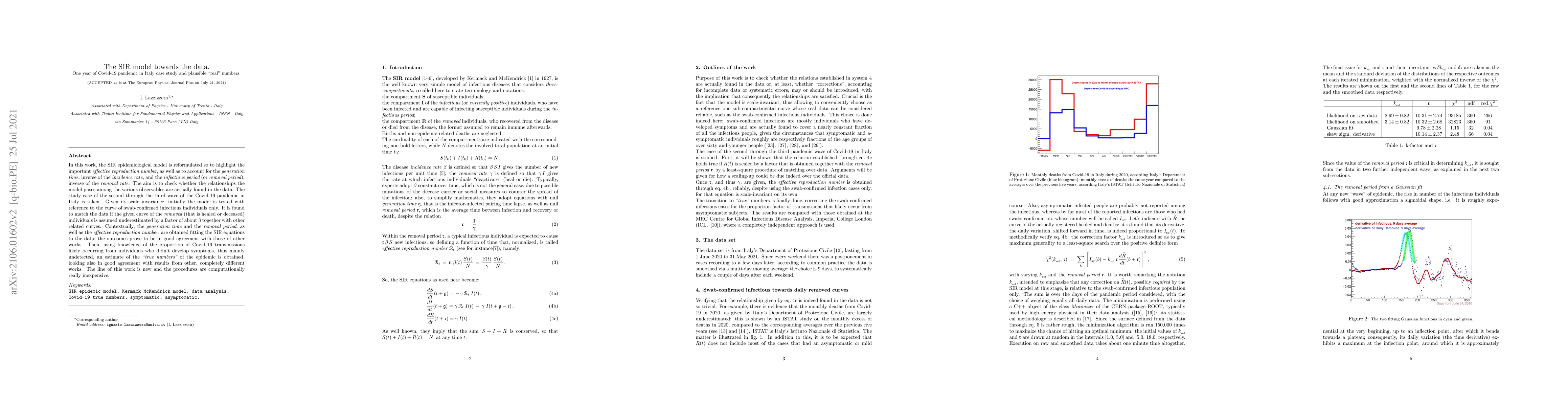A study reformulates the SIR model to account for key factors in COVID-19 transmission, fitting it to Italian pandemic data from 2020-2021. The results suggest that effective reproduction numbers, generation times, and removal periods were consistent with other studies, allowing for estimates of 'true numbers' of the epidemic.