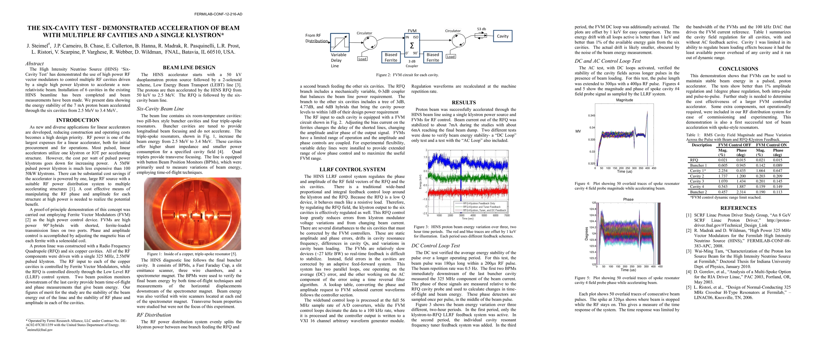 The High Intensity Neutrino Source (HINS) Six-Cavity Test has demonstrated the use of high power RF vector modulators to control multiple RF cavities driven by a single high power klystron to accelerate a non-relativistic beam. Installation of 6 cavities in the existing HINS beamline has been completed and beam measurements have started. We present data showing the energy stability of the 7 mA proton beam accelerated through the six cavities from 2.5 MeV to 3.4 MeV.