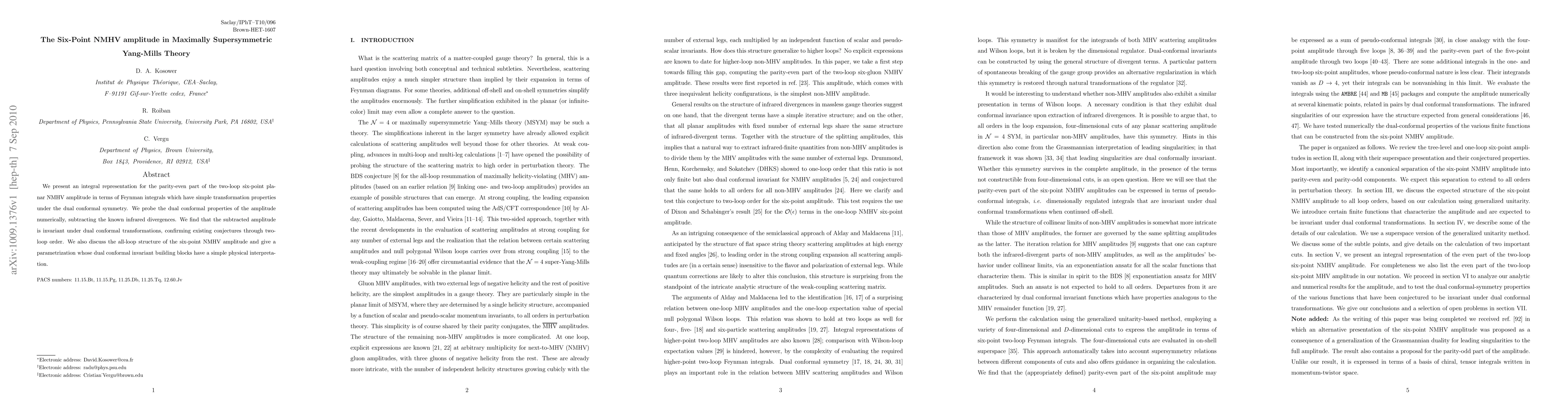 This paper presents an integral representation for the two-loop six-point planar NMHV amplitude in maximally supersymmetric Yang-Mills theory, confirming its invariance under dual conformal transformations through numerical analysis and supporting existing conjectures. It also discusses the all-loop structure and provides a parametrization of the amplitude with clear physical interpretations.