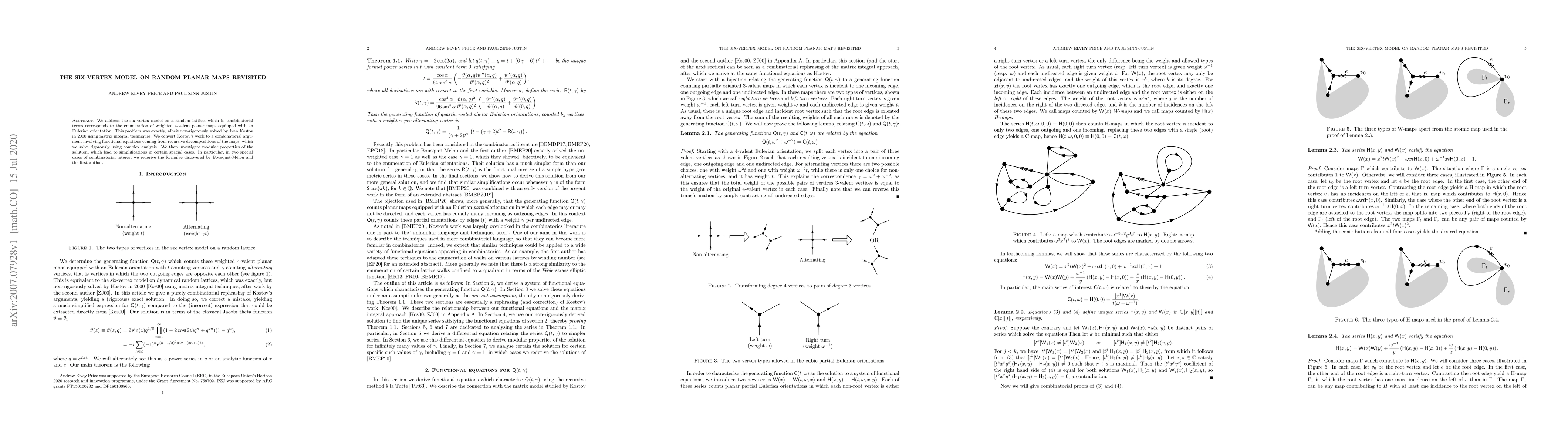 We address the six vertex model on a random lattice, which in combinatorial terms corresponds to the enumeration of weighted 4-valent planar maps equipped with an Eulerian orientation. This problem was exactly, albeit non-rigorously solved by Ivan Kostov in 2000 using matrix integral techniques. We convert Kostov's work to a combinatorial argument involving functional equations coming from recursive decompositions of the maps, which we solve rigorously using complex analysis. We then investigate modular properties of the solution, which lead to simplifications in certain special cases. In particular, in two special cases of combinatorial interest we rederive the formulae discovered by Bousquet-M\'elou and the first author.