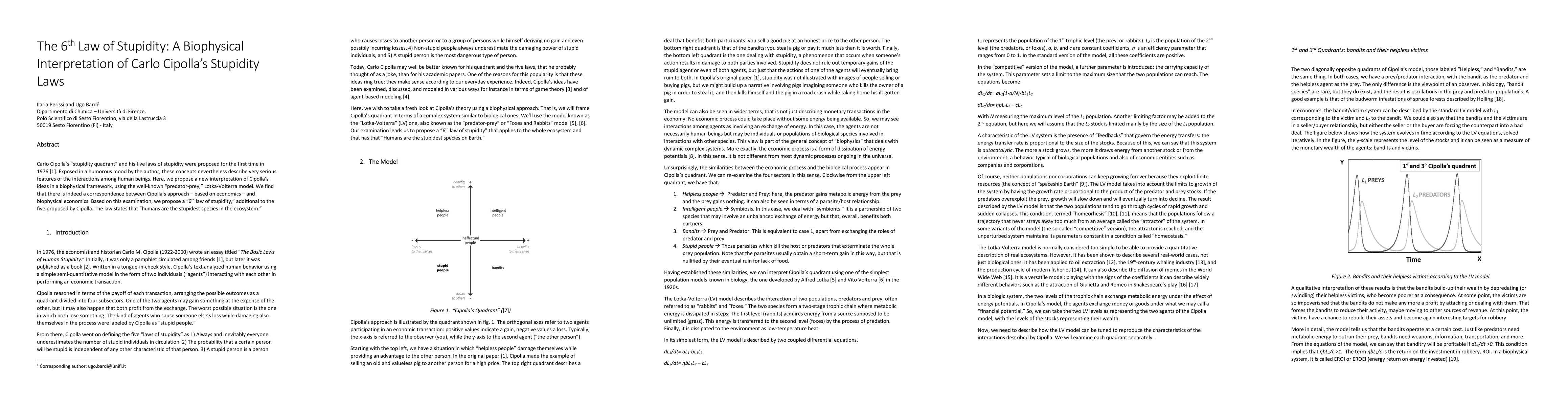 This paper reinterprets Carlo Cipolla's five laws of stupidity within a biophysical framework, using the Lotka-Volterra model, and proposes a sixth law asserting that humans are the most "stupid" species in the ecosystem. The study underscores the serious implications of human behavior through a humorous yet insightful analysis.