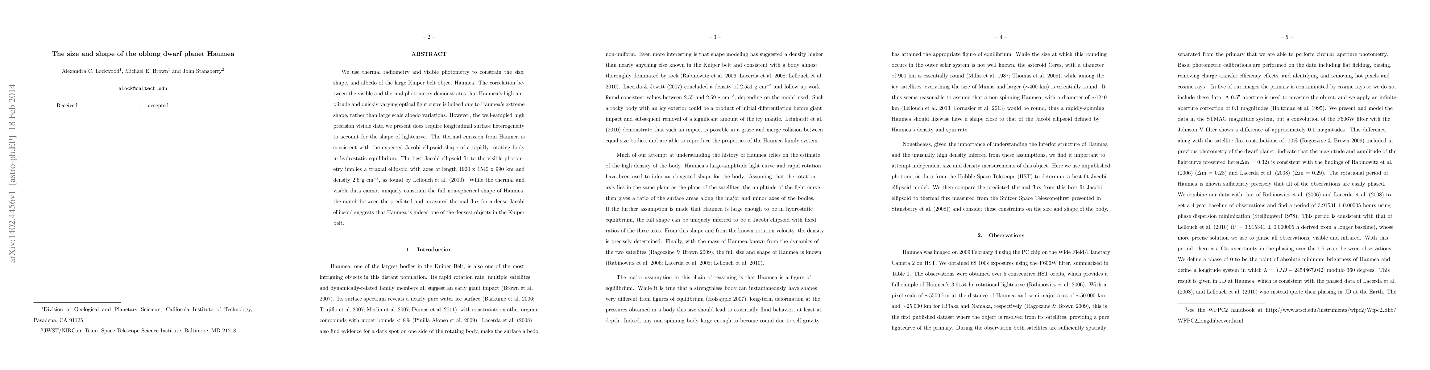 This paper uses thermal radiometry and visible photometry to determine the size, shape, and albedo of Haumea, revealing its extreme shape causes its high amplitude light curve. The best fit Jacobi ellipsoid model suggests Haumea is a triaxial body with axes of 1920 x 1540 x 990 km and is one of the densest objects in the Kuiper belt.