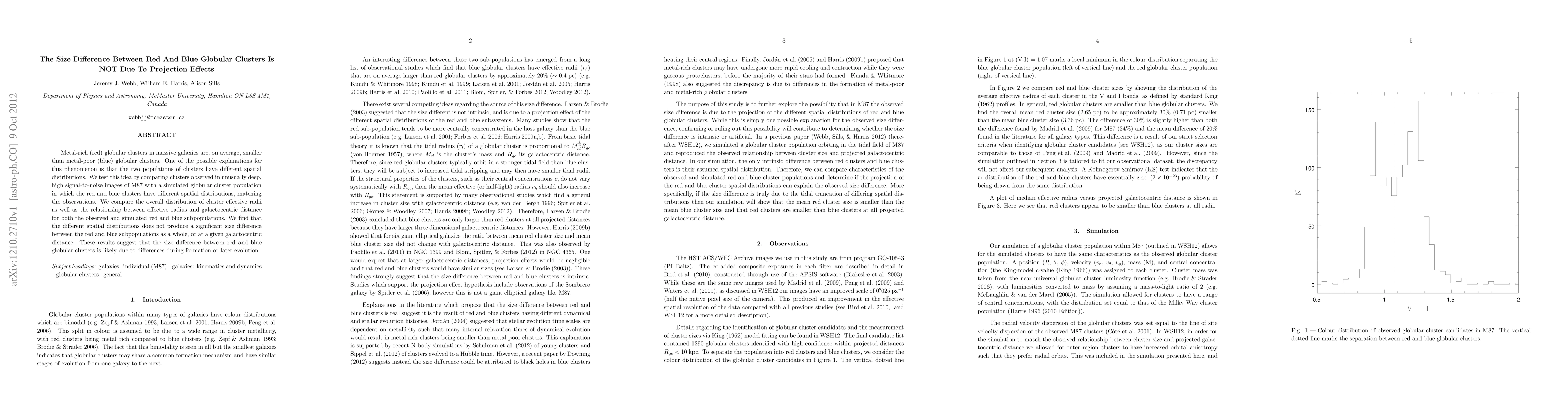 This study finds that the size difference between metal-rich (red) and metal-poor (blue) globular clusters in galaxies is not due to projection effects from different spatial distributions. Instead, the observed size disparity likely stems from differences in formation or subsequent evolution.