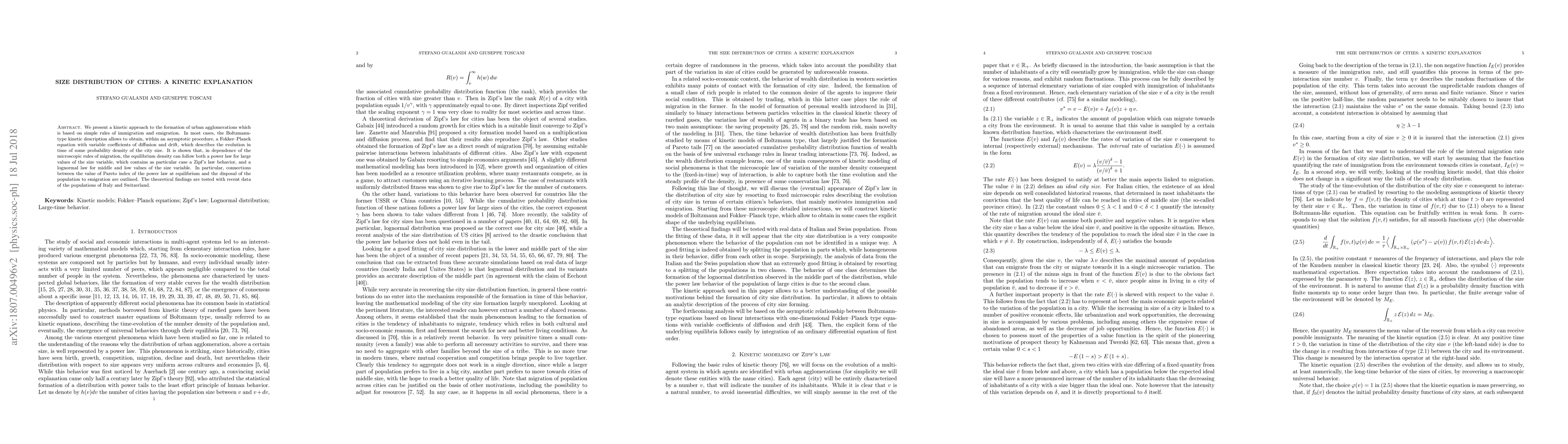 We present a kinetic approach to the formation of urban agglomerations which is based on simple rules of immigration and emigration. In most cases, the Boltzmann-type kinetic description allows to obtain, within an asymptotic procedure, a Fokker--Planck equation with variable coefficients of diffusion and drift, which describes the evolution in time of some probability density of the city size. It is shown that, in dependence of the microscopic rules of migration, the equilibrium density can follow both a power law for large values of the size variable, which contains as particular case a Zipf's law behavior, and a lognormal law for middle and low values of the size variable. In particular, connections between the value of Pareto index of the power law at equilibrium and the disposal of the population to emigration are outlined. The theoretical findings are tested with recent data of the populations of Italy and Switzerland.