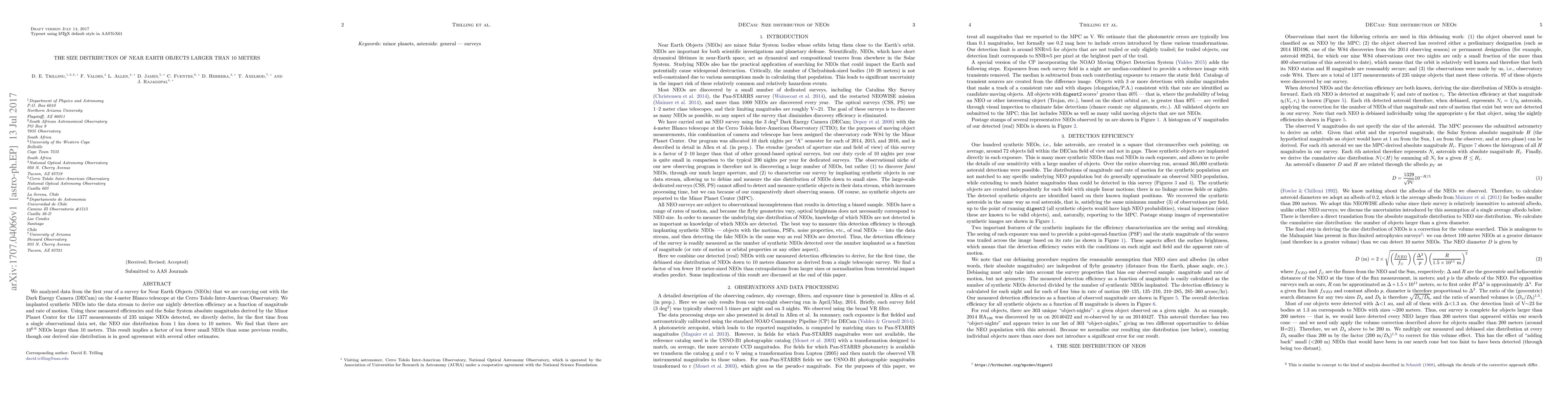 We analyzed data from the first year of a survey for Near Earth Objects (NEOs) that we are carrying out with the Dark Energy Camera (DECam) on the 4-meter Blanco telescope at the Cerro Tololo Inter-American Observatory. We implanted synthetic NEOs into the data stream to derive our nightly detection efficiency as a function of magnitude and rate of motion. Using these measured efficiencies and the Solar System absolute magnitudes derived by the Minor Planet Center for the 1377 measurements of 235 unique NEOs detected, we directly derive, for the first time from a single observational data set, the NEO size distribution from 1 km down to 10 meters. We find that there are 10^6.6 NEOs larger than 10 meters. This result implies a factor of ten fewer small NEOs than some previous results, though our derived size distribution is in good agreement with several other estimates.