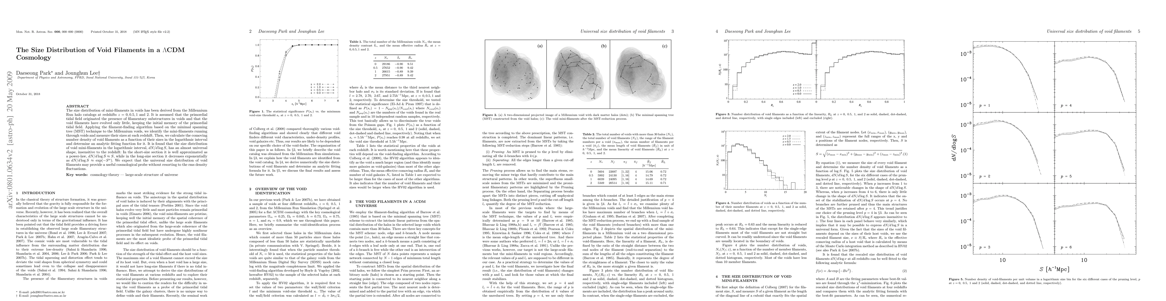 This paper derives the size distribution of void filaments in LCDM cosmology from Millennium Run halo catalogs at various redshifts, finding an almost universal shape that is power-law for small sizes and exponential for large sizes, suggesting it as a potential cosmological probe.