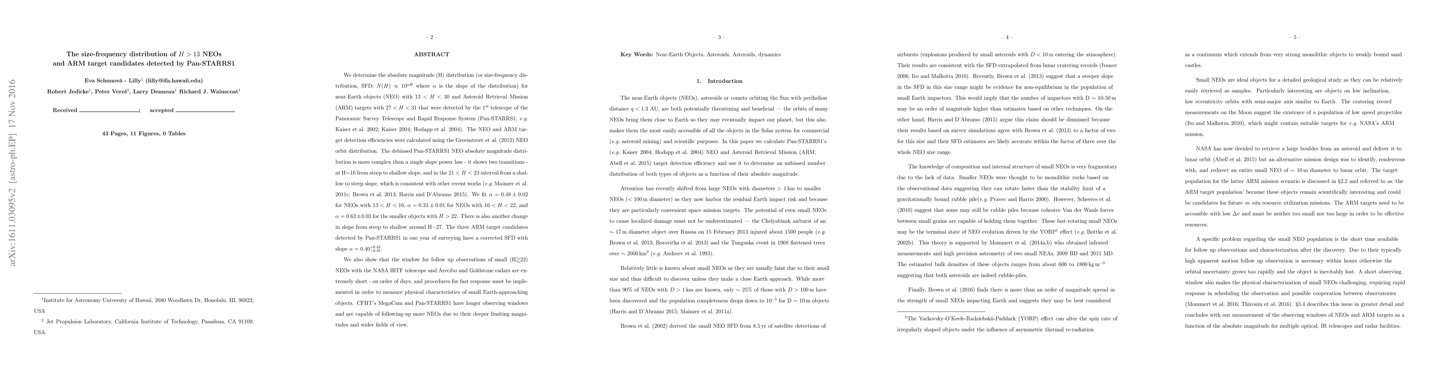 This study analyzes the size-frequency distribution of H>13 near-Earth objects (NEOs) and Asteroid Retrieval Mission (ARM) targets detected by Pan-STARRS1, revealing complex transitions in the distribution slopes. Follow-up observations for small NEOs require rapid response due to short windows.