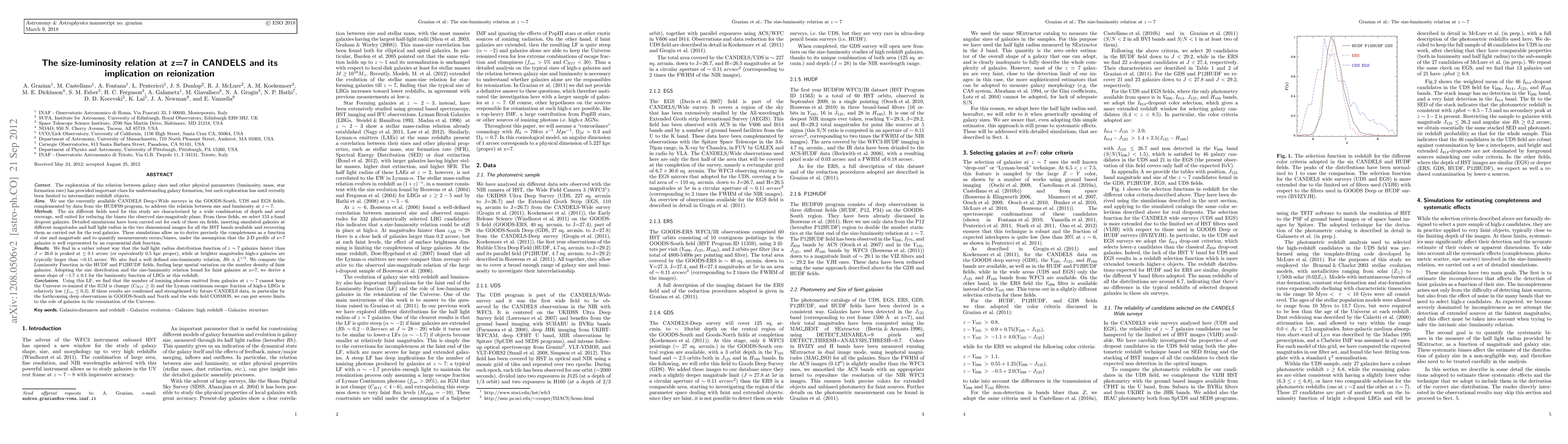 This paper investigates the size-luminosity relation of galaxies at z=7 using CANDELS surveys, finding a size-luminosity correlation (Rh~L^1/2). The study suggests that faint galaxies at this redshift have small sizes, while brighter galaxies are larger, and concludes that the ionizing photon output from these galaxies may be insufficient to fully reionize a clumpy intergalactic medium if the escape fraction is low.