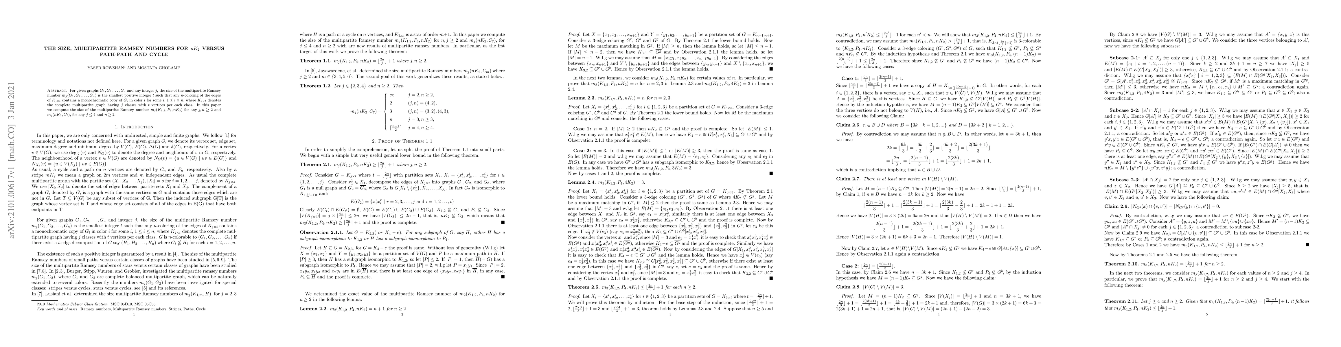 The paper computes the size of multipartite Ramsey numbers for specific graph combinations, including K_{1,2}, P_4, and nK_2, providing insights into graph colorings and monochromatic copies.