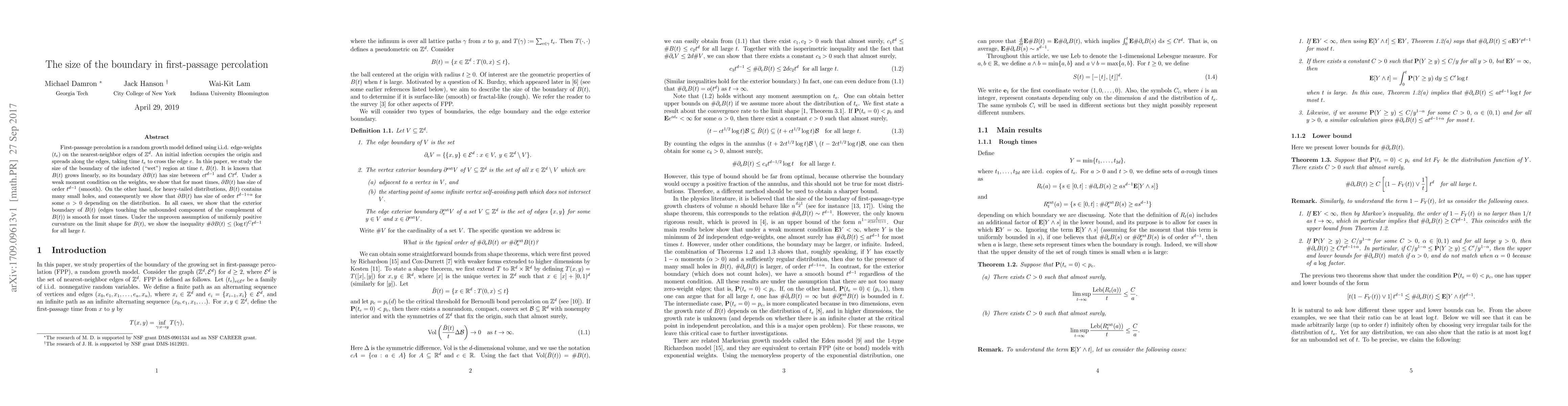 Researchers studied the boundary of an infected region in a random growth model, finding that for most times, it grows smoothly like the surface area of a sphere, but for heavy-tailed distributions, it has smaller holes and grows more slowly. The exterior boundary is always smooth.