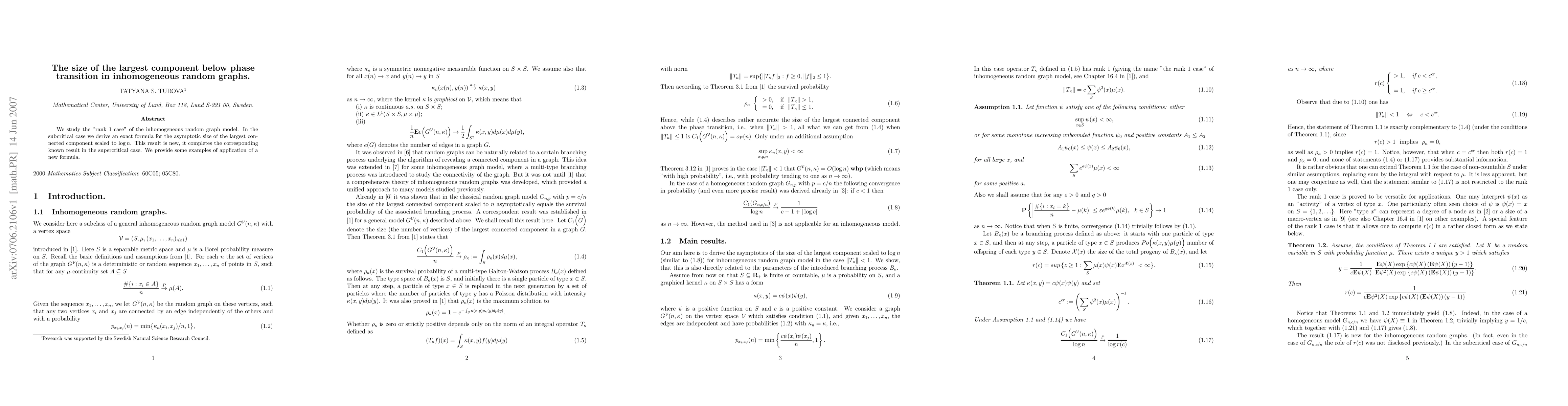 This paper derives an exact formula for the asymptotic size of the largest connected component in the subcritical phase of the "rank 1 case" of inhomogeneous random graphs, completing the known result for the supercritical phase. The new formula is demonstrated through several application examples.