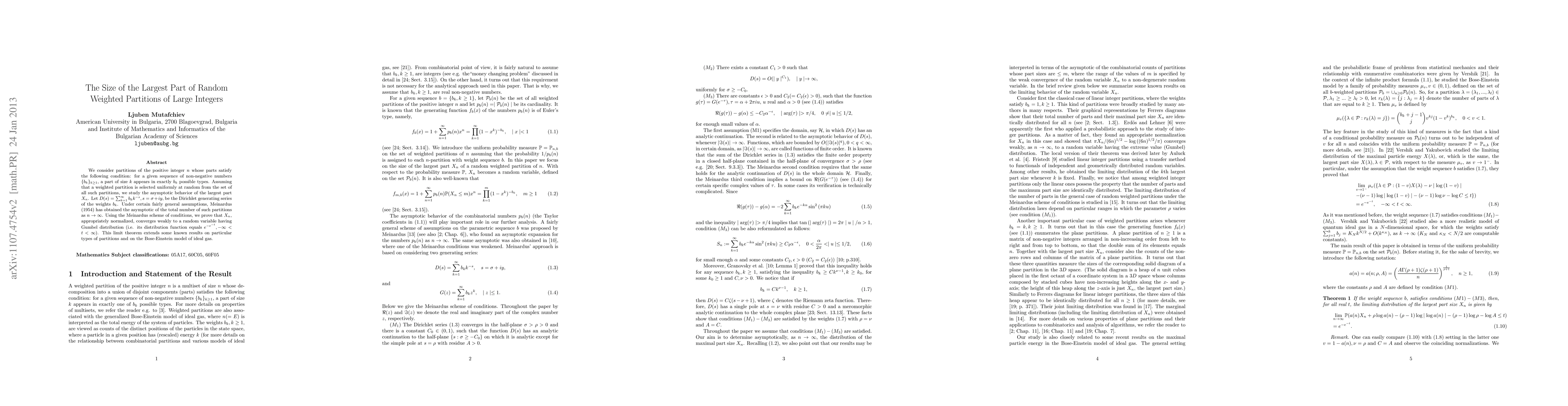 The paper demonstrates that for random weighted partitions of large integers, the size of the largest part, normalized appropriately, converges to Gumbel's extreme value distribution as the integer size increases. This result extends previous findings on specific partition types and the Bose-Einstein ideal gas model.