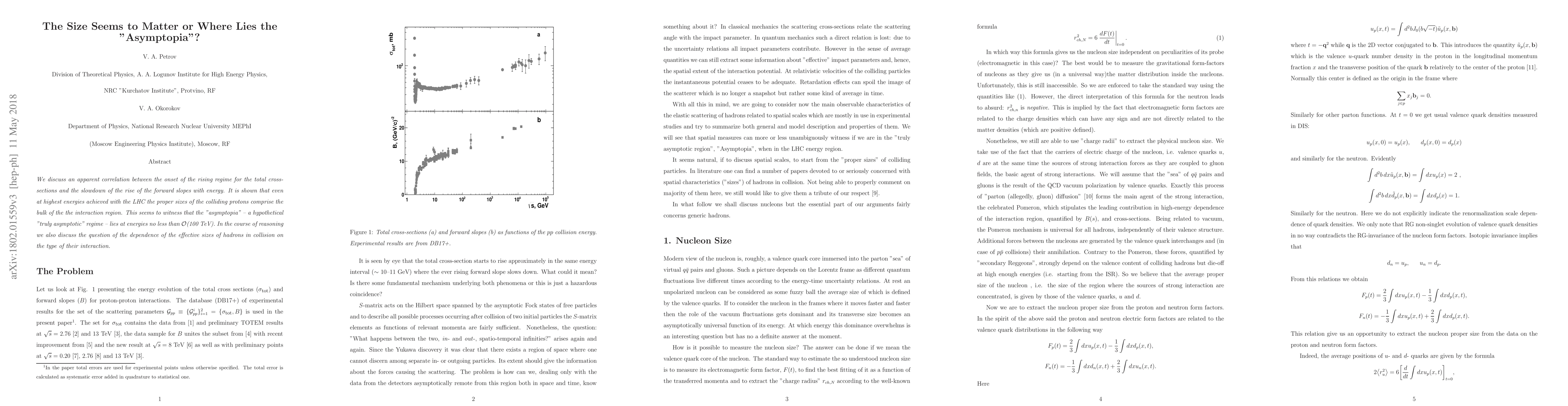 We discuss an apparent correlation between the onset of the rising regime for the total cross-sections and the slowdown of the rise of the forward slopes with energy. It is shown that even at highest energies achieved with the LHC the proper sizes of the colliding protons comprise the bulk of the the interaction region. This seems to witness that the "asymptopia" - a hypothetical "truly asymptotic" regime - lies at energies no less than $\mathcal{O}$(100 TeV). In the course of reasoning we also discuss the question of the dependence of the effective sizes of hadrons in collision on the type of their interaction.