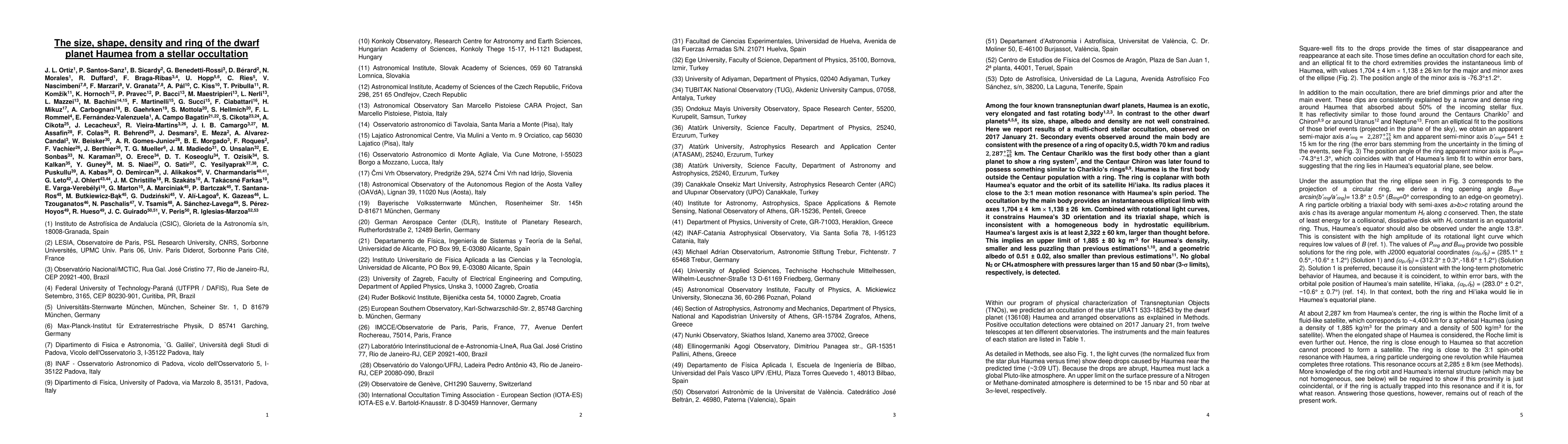 This study reveals the size, shape, and density of the dwarf planet Haumea through a stellar occultation, finding it to be an elongated, elliptical body with a ring. The ring, first for a non-Centaur body, is coplanar with Haumea's equator and its satellite's orbit, and Haumea's largest axis is larger than previously estimated, leading to a revised, lower density and albedo.