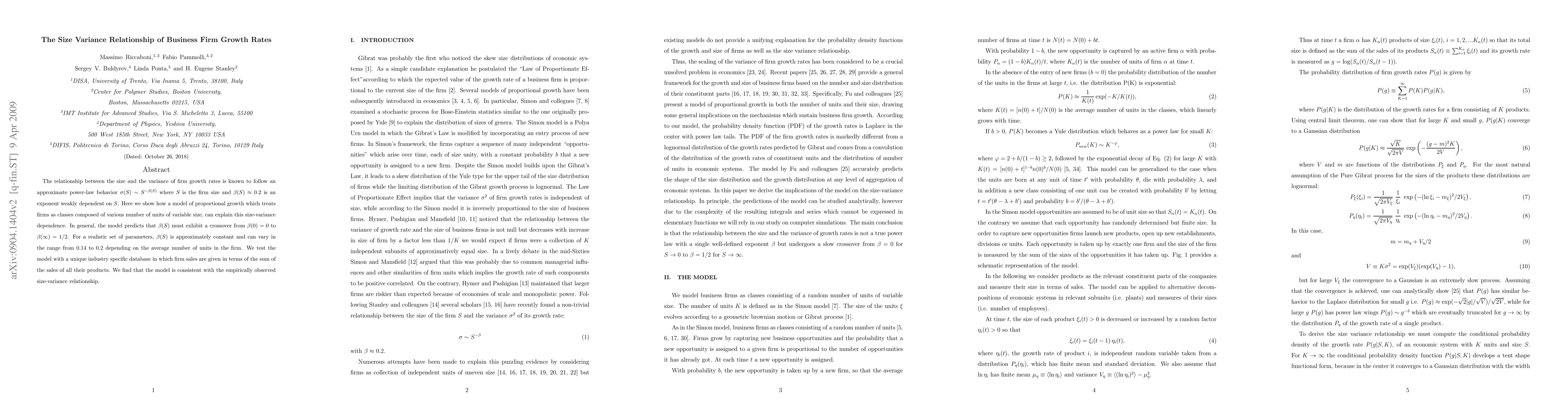 The relationship between the size and the variance of firm growth rates is known to follow an approximate power-law behavior $\sigma(S) \sim S^{-\beta(S)}$ where $S$ is the firm size and $\beta(S)\approx 0.2$ is an exponent weakly dependent on $S$. Here we show how a model of proportional growth which treats firms as classes composed of various number of units of variable size, can explain this size-variance dependence. In general, the model predicts that $\beta(S)$ must exhibit a crossover from $\beta(0)=0$ to $\beta(\infty)=1/2$. For a realistic set of parameters, $\beta(S)$ is approximately constant and can vary in the range from 0.14 to 0.2 depending on the average number of units in the firm. We test the model with a unique industry specific database in which firm sales are given in terms of the sum of the sales of all their products. We find that the model is consistent with the empirically observed size-variance relationship.