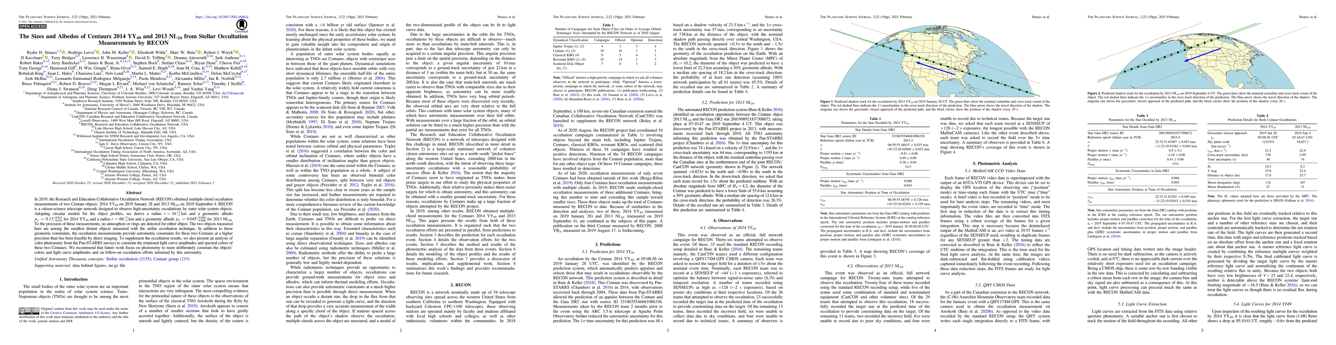 In 2019, the Research and Education Collaborative Occultation Network (RECON) obtained multiple-chord occultation measurements of two centaur objects: 2014 YY$_{49}$ on 2019 January 28 and 2013 NL$_{24}$ on 2019 September 4. RECON is a citizen-science telescope network designed to observe high-uncertainty occultations by outer solar system objects. Adopting circular models for the object profiles, we derive a radius $r=16^{+2}_{-1}$km and a geometric albedo $p_V=0.13^{+0.015}_{-0.024}$ for 2014 YY$_{49}$, and a radius $r=66 ^{+5}_{-5}$km and geometric albedo $p_V = 0.045^{+0.006}_{-0.008}$ for 2013 NL$_{24}$. To the precision of these measurements, no atmosphere or rings are detected for either object. The two objects measured here are among the smallest distant objects measured with the stellar occultation technique. In addition to these geometric constraints, the occultation measurements provide astrometric constraints for these two centaurs at a higher precision than has been feasible by direct imaging. To supplement the occultation results, we also present an analysis of color photometry from the Pan-STARRS surveys to constrain the rotational light curve amplitudes and spectral colors of these two centaurs. We recommend that future work focus on photometry to more deliberately constrain the objects' colors and light curve amplitudes, and on follow-on occultation efforts informed by this astrometry.