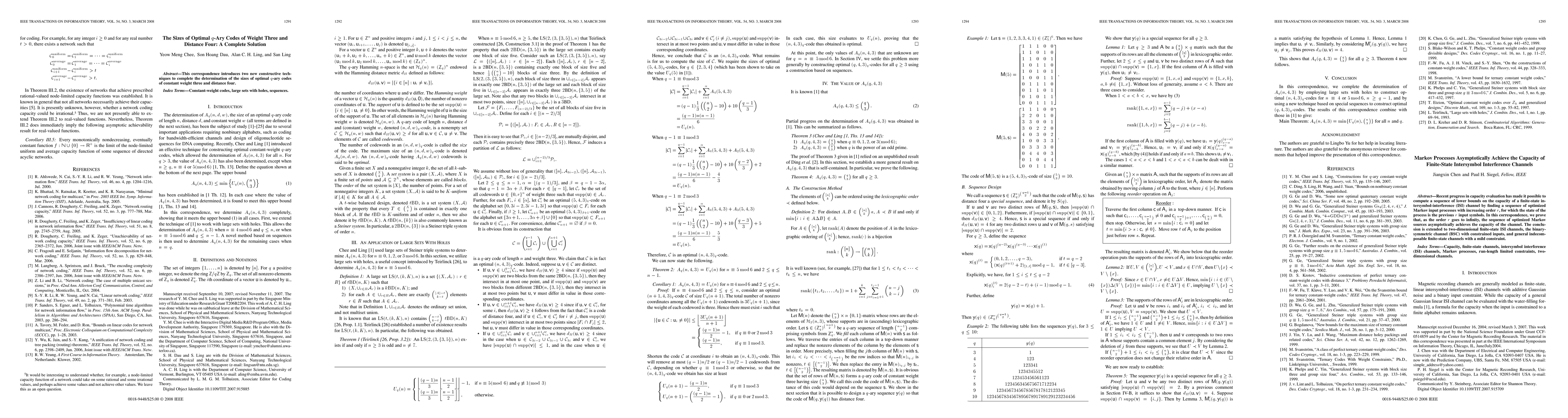 This paper presents two new constructive techniques to fully determine the sizes of optimal q-ary codes with a fixed weight of three and a minimum distance of four, providing a complete solution to this problem.