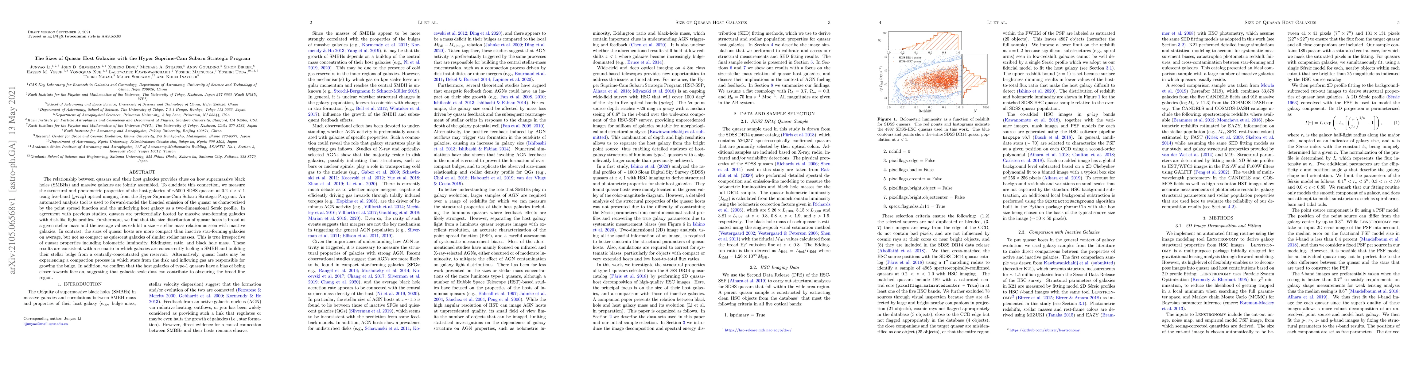 This study investigates the sizes of quasar host galaxies using Hyper Suprime-Cam Subaru data, revealing that quasars predominantly reside in massive, star-forming galaxies with disk-like profiles. The findings suggest quasar hosts are more compact than typical star-forming galaxies but less so than quiescent galaxies, indicating concurrent SMBH fueling and stellar bulge formation or a compaction process.