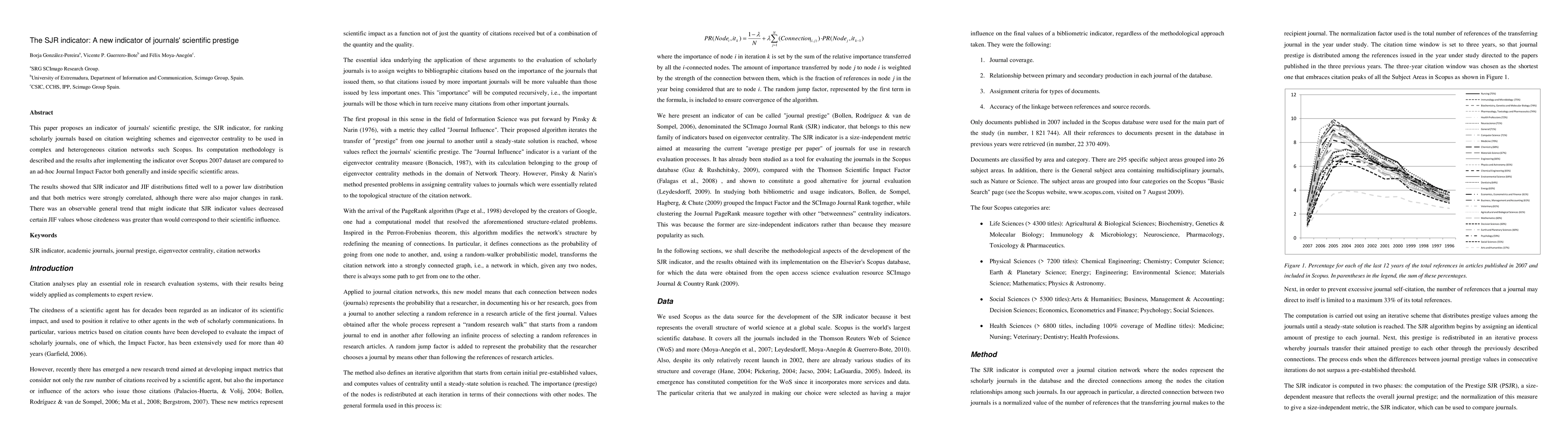 This paper introduces the SJR indicator for ranking scholarly journals based on citation weighting and eigenvector centrality, comparing its results to the Journal Impact Factor (JIF) across various scientific fields. The study finds that while both metrics are strongly correlated, the SJR indicator often re-ranks journals, suggesting it may better reflect scientific influence than JIF.