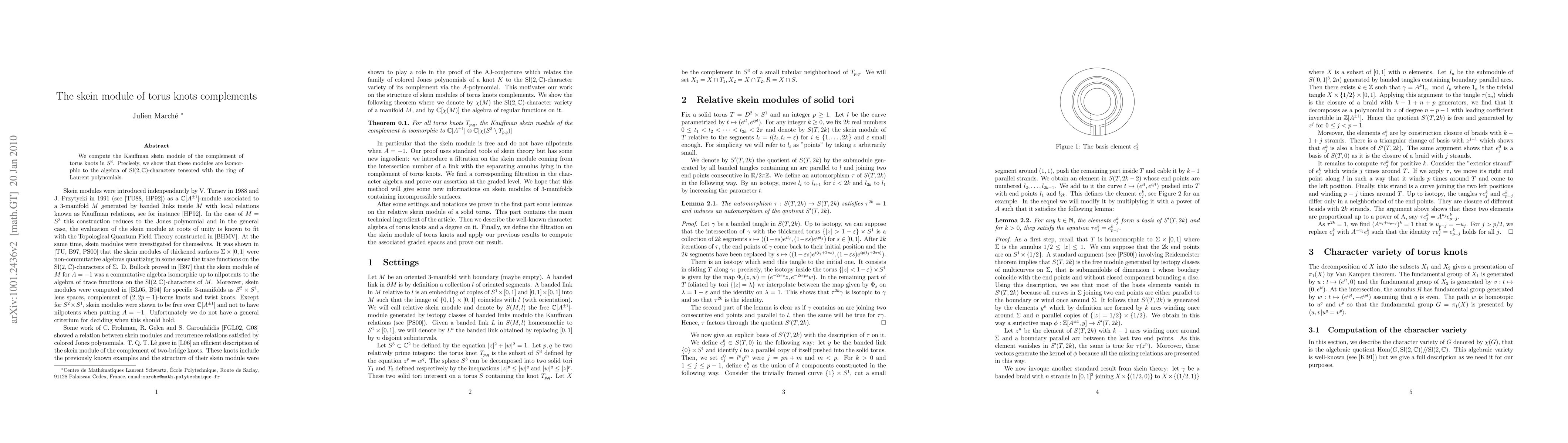 The paper computes the Kauffman skein module of torus knot complements in S^3, demonstrating their isomorphism to the algebra of Sl(2,C)-characters tensored with the ring of Laurent polynomials. This provides a significant algebraic structure for understanding these knot complements.