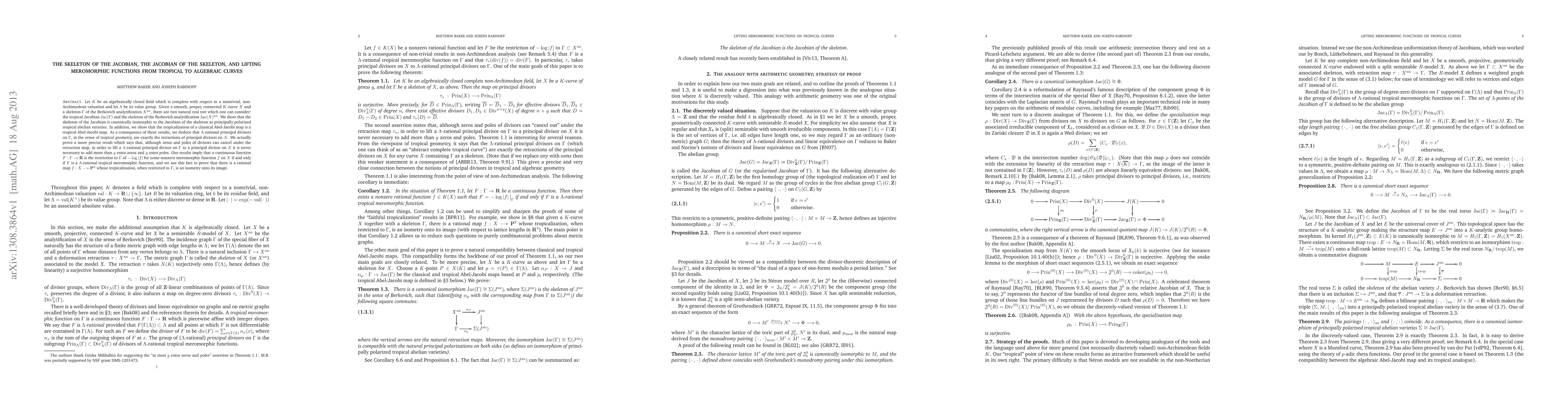This paper investigates the relationship between tropical and algebraic curves, showing that the skeleton of the Jacobian of a Berkovich analytification is isomorphic to the Jacobian of the skeleton. It also proves that lifting meromorphic functions from tropical to algebraic curves requires adding at most g extra zeros and poles, and establishes a correspondence between continuous functions on the skeleton and meromorphic functions on the algebraic curve.