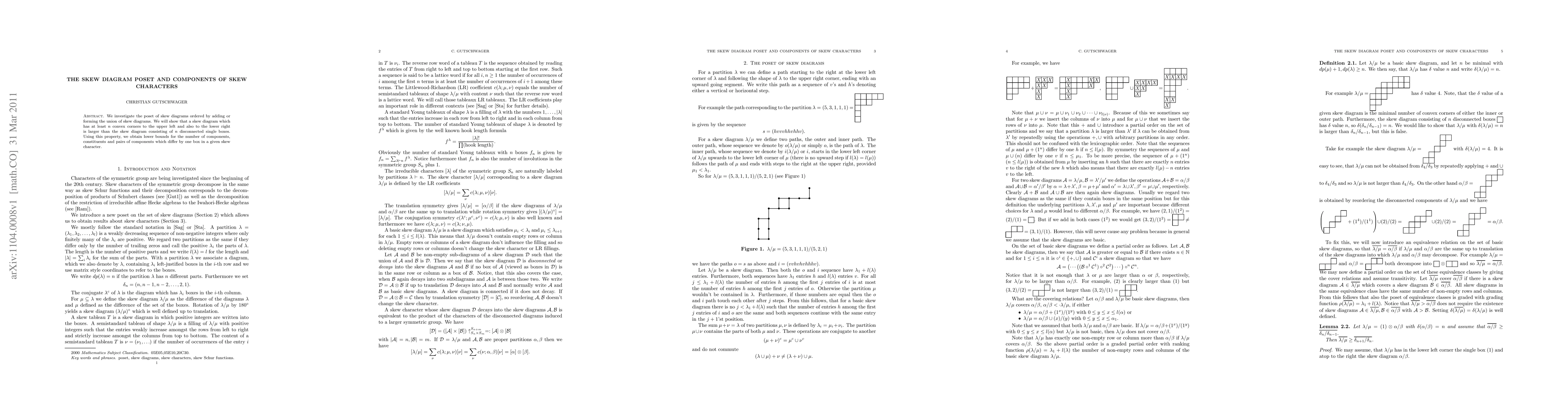 We investigate the poset of skew diagrams ordered by adding or forming the union of skew diagrams. We will show that a skew diagram which has at least n convex corners to the upper left and also to the lower right is larger than the skew diagram consisting of n disconnected single boxes. Using this property, we obtain lower bounds for the number of components, constituents and pairs of components which differ by one box in a given skew character.