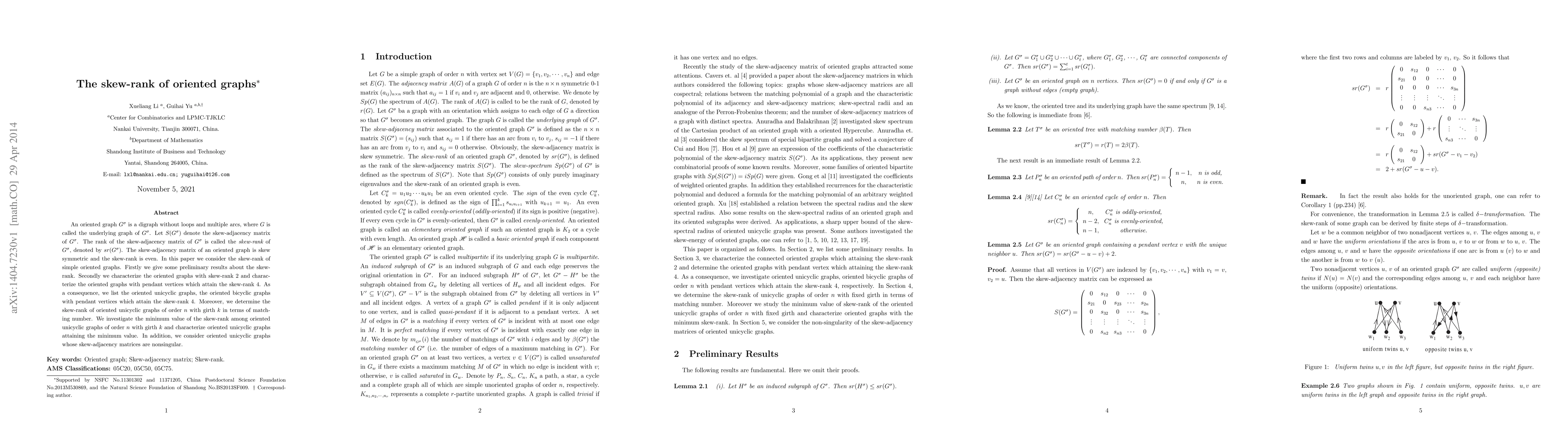 This paper investigates the skew-rank of simple oriented graphs, defining it as the rank of their skew-adjacency matrices, which are skew-symmetric and have even ranks. It characterizes oriented graphs with skew-ranks 2 and 4, particularly those with pendant vertices, and determines the skew-rank of oriented unicyclic graphs in terms of their matching number.