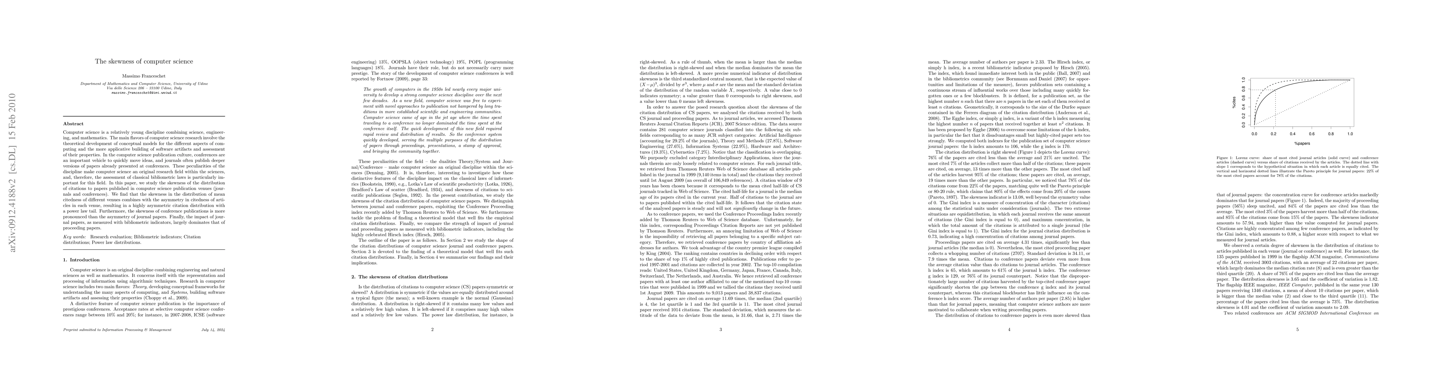 Computer science is a relatively young discipline combining science, engineering, and mathematics. The main flavors of computer science research involve the theoretical development of conceptual models for the different aspects of computing and the more applicative building of software artifacts and assessment of their properties. In the computer science publication culture, conferences are an important vehicle to quickly move ideas, and journals often publish deeper versions of papers already presented at conferences. These peculiarities of the discipline make computer science an original research field within the sciences, and, therefore, the assessment of classical bibliometric laws is particularly important for this field. In this paper, we study the skewness of the distribution of citations to papers published in computer science publication venues (journals and conferences). We find that the skewness in the distribution of mean citedness of different venues combines with the asymmetry in citedness of articles in each venue, resulting in a highly asymmetric citation distribution with a power law tail. Furthermore, the skewness of conference publications is more pronounced than the asymmetry of journal papers. Finally, the impact of journal papers, as measured with bibliometric indicators, largely dominates that of proceeding papers.