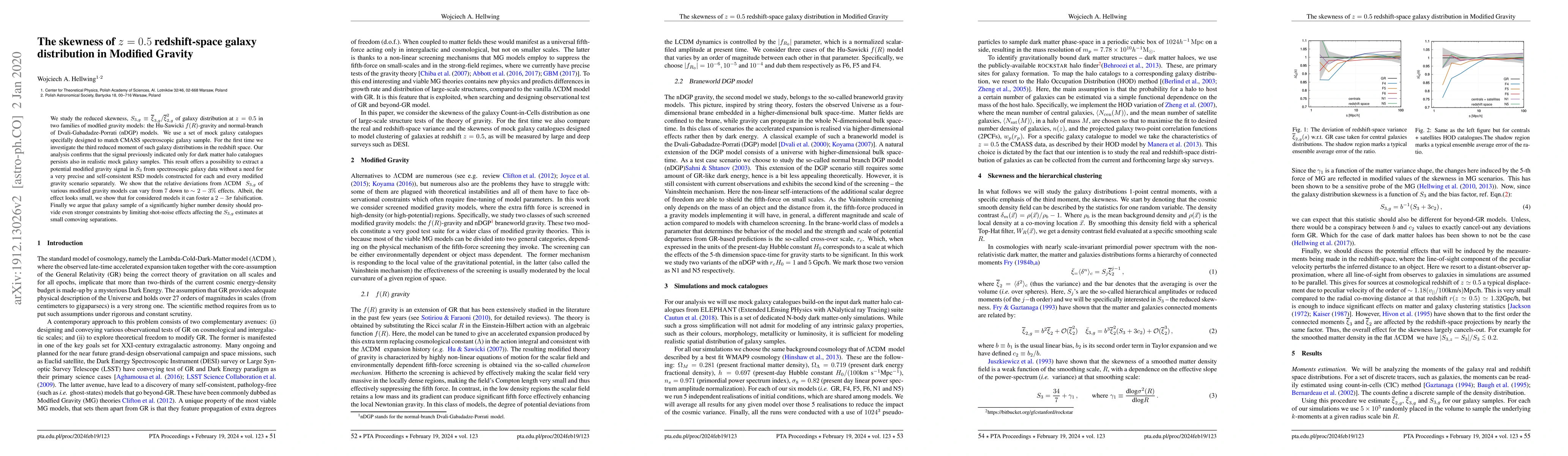 This study investigates the skewness of galaxy distributions in modified gravity models using mock galaxy catalogues, revealing relative deviations of 2-3% from LambdaCDM predictions that can be used to falsify certain models.