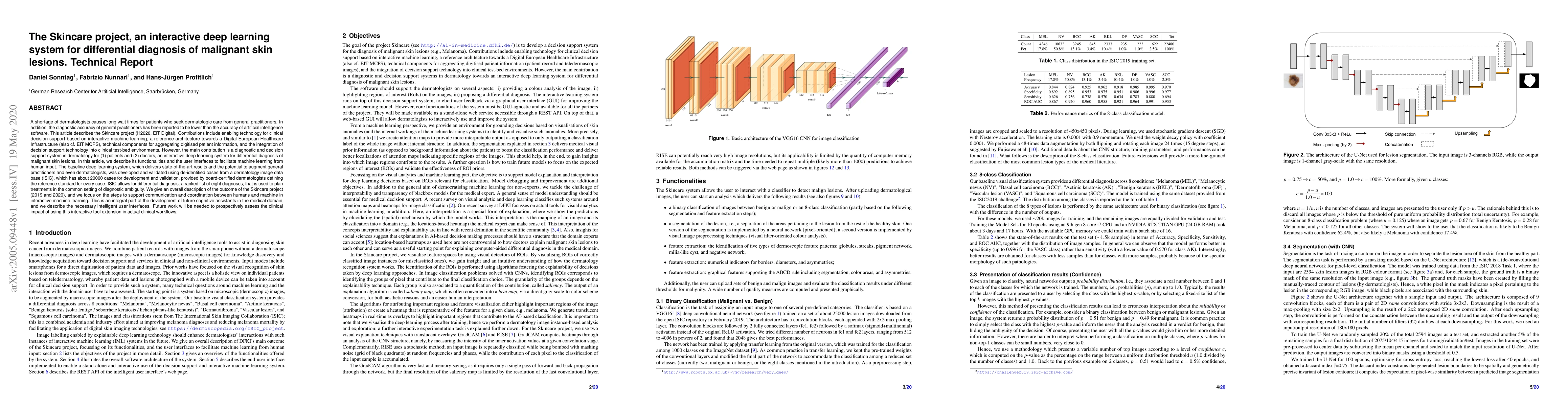 The Skincare project develops an interactive deep learning system to aid in the differential diagnosis of malignant skin lesions, aiming to augment general practitioners and dermatologists. The system leverages a large dataset from ISIC and focuses on integrating human input to enhance machine learning and decision support in dermatology.