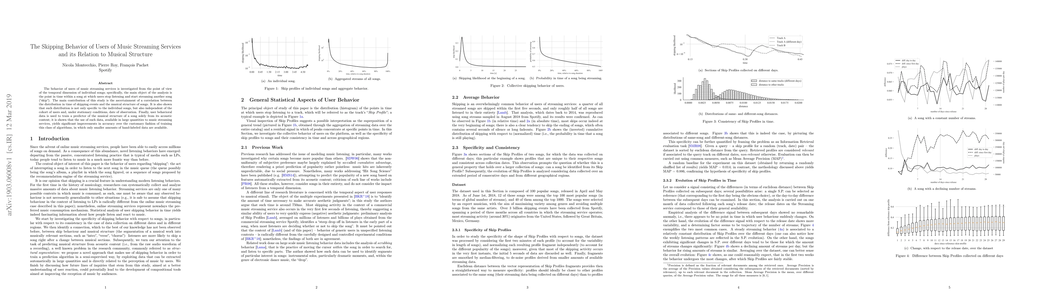 This study investigates how users of music streaming services skip songs, finding a correlation between skipping behavior and musical structure. It reveals that skipping patterns are consistent across songs and independent of users and time, and demonstrates improved accuracy in predicting musical structure using large-scale user data instead of smaller labeled datasets.