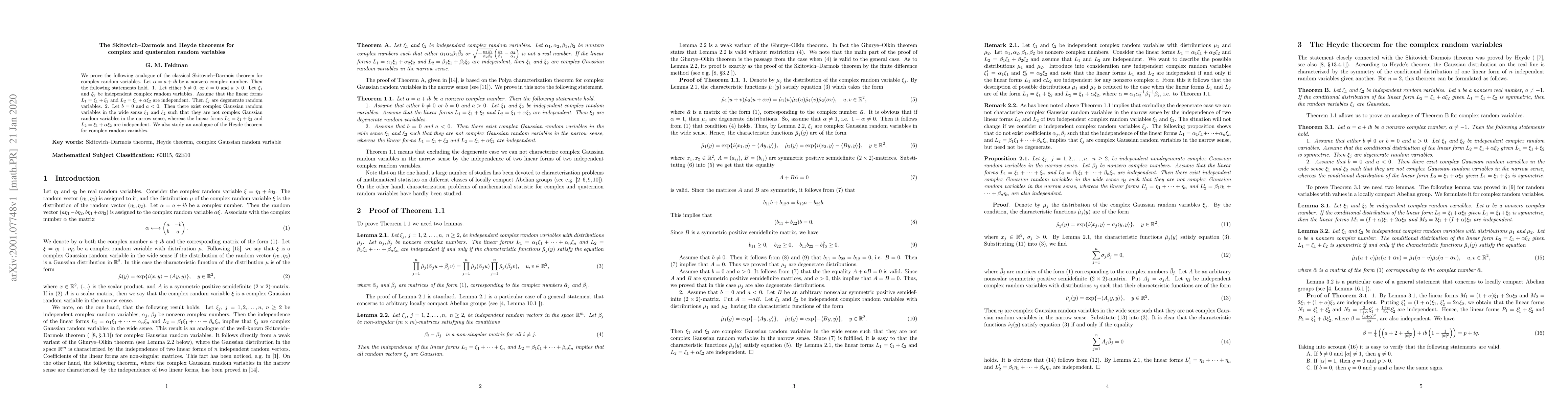 The paper proves analogues of the Skitovich-Darmois theorem for complex and quaternion random variables, exploring conditions under which linear forms between independent random variables are independent, and conditions for non-Gaussian complexity.