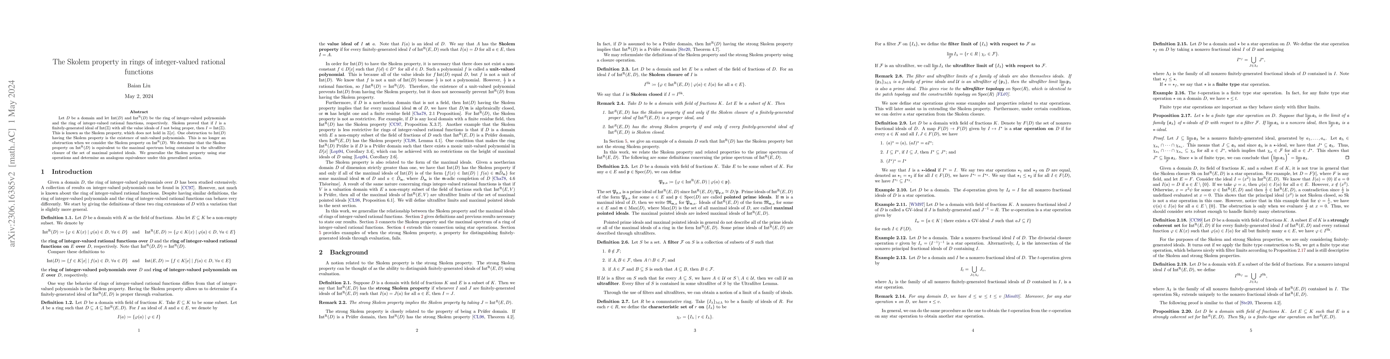 This paper explores the Skolem property in the ring of integer-valued rational functions, $\IntR(D)$, proving that it holds if the maximal spectrum is contained within the ultrafilter closure of maximal pointed ideals. The authors generalize the Skolem property using star operations and establish an analogous equivalence.