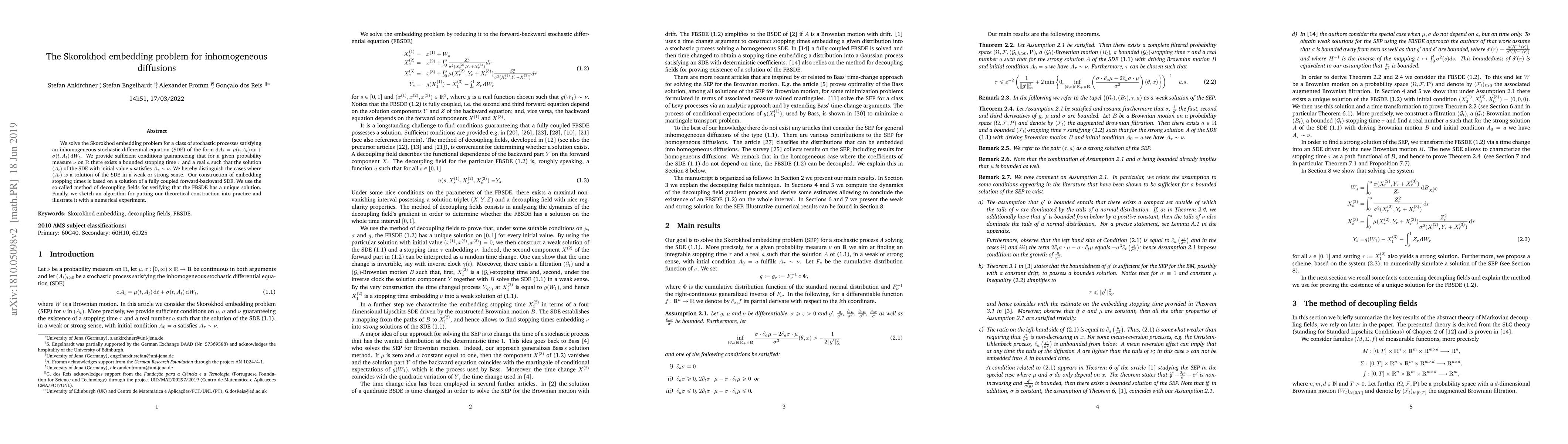 This paper solves the Skorokhod embedding problem for inhomogeneous diffusions governed by stochastic differential equations, providing conditions for embedding a given probability measure. It constructs embedding stopping times via a fully coupled forward-backward SDE and verifies its unique solution using decoupling fields.
