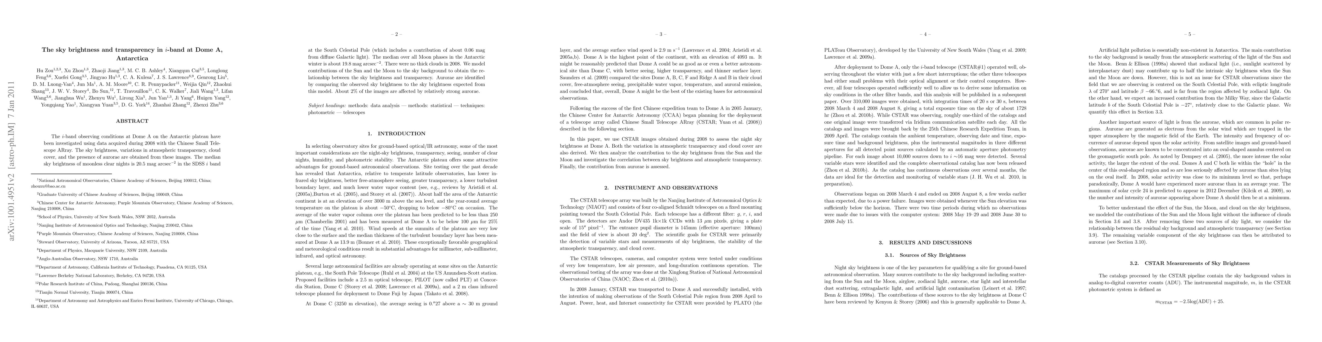 Researchers studied sky brightness at Dome A, Antarctica, finding median sky brightness of 20.5 mag arcsec^{-2} during moonless nights, with variations due to transparency and aurorae.