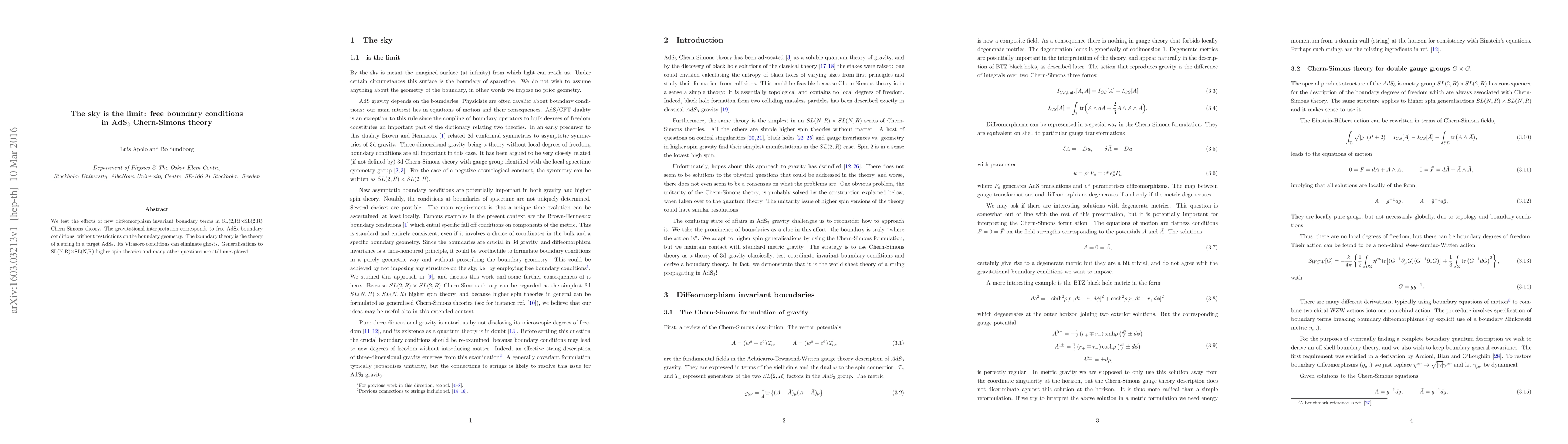 We test the effects of new diffeomorphism invariant boundary terms in SL(2,R)$\times$SL(2,R) Chern-Simons theory. The gravitational interpretation corresponds to free AdS$_3$ boundary conditions, without restrictions on the boundary geometry. The boundary theory is the theory of a string in a target AdS$_3$. Its Virasoro conditions can eliminate ghosts. Generalisations to SL(N,R)$\times$SL(N,R) higher spin theories and many other questions are still unexplored.